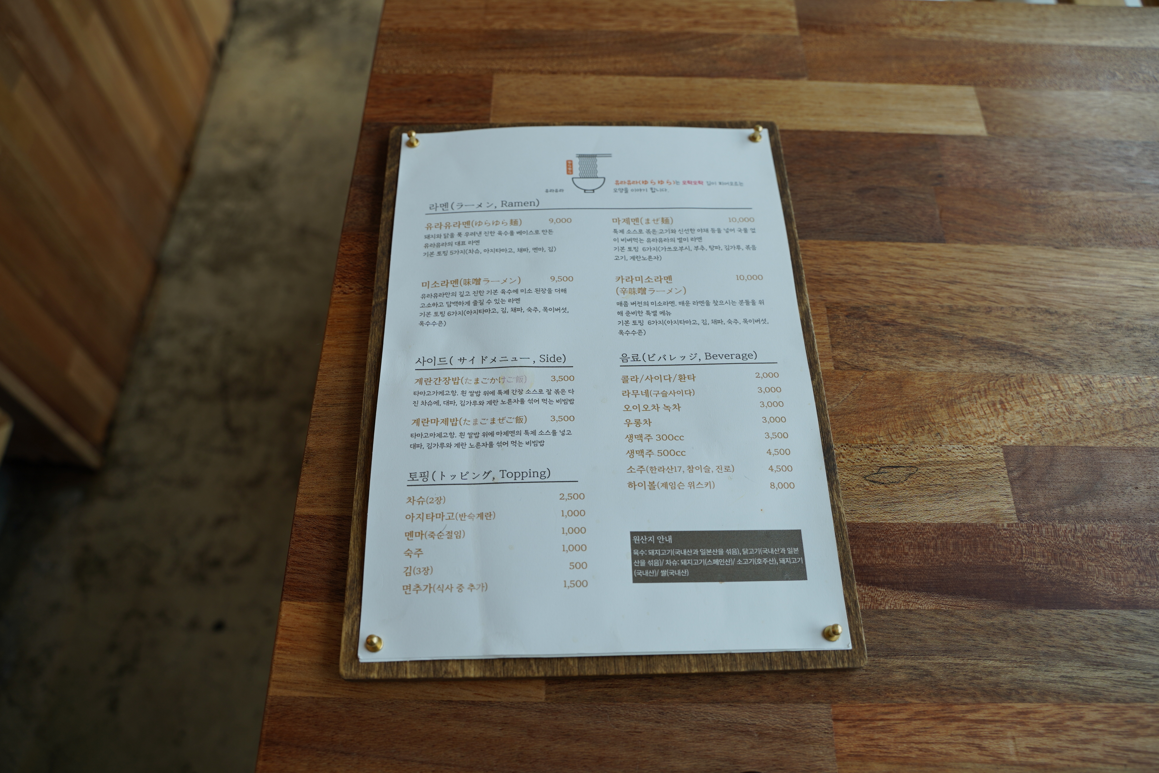 일본식라멘 전문점으로 유라유라멘, 미소라멘, 마제멘, 계란간장밥 등등 특별하고 맛있는 메뉴가 많아 보였어요.