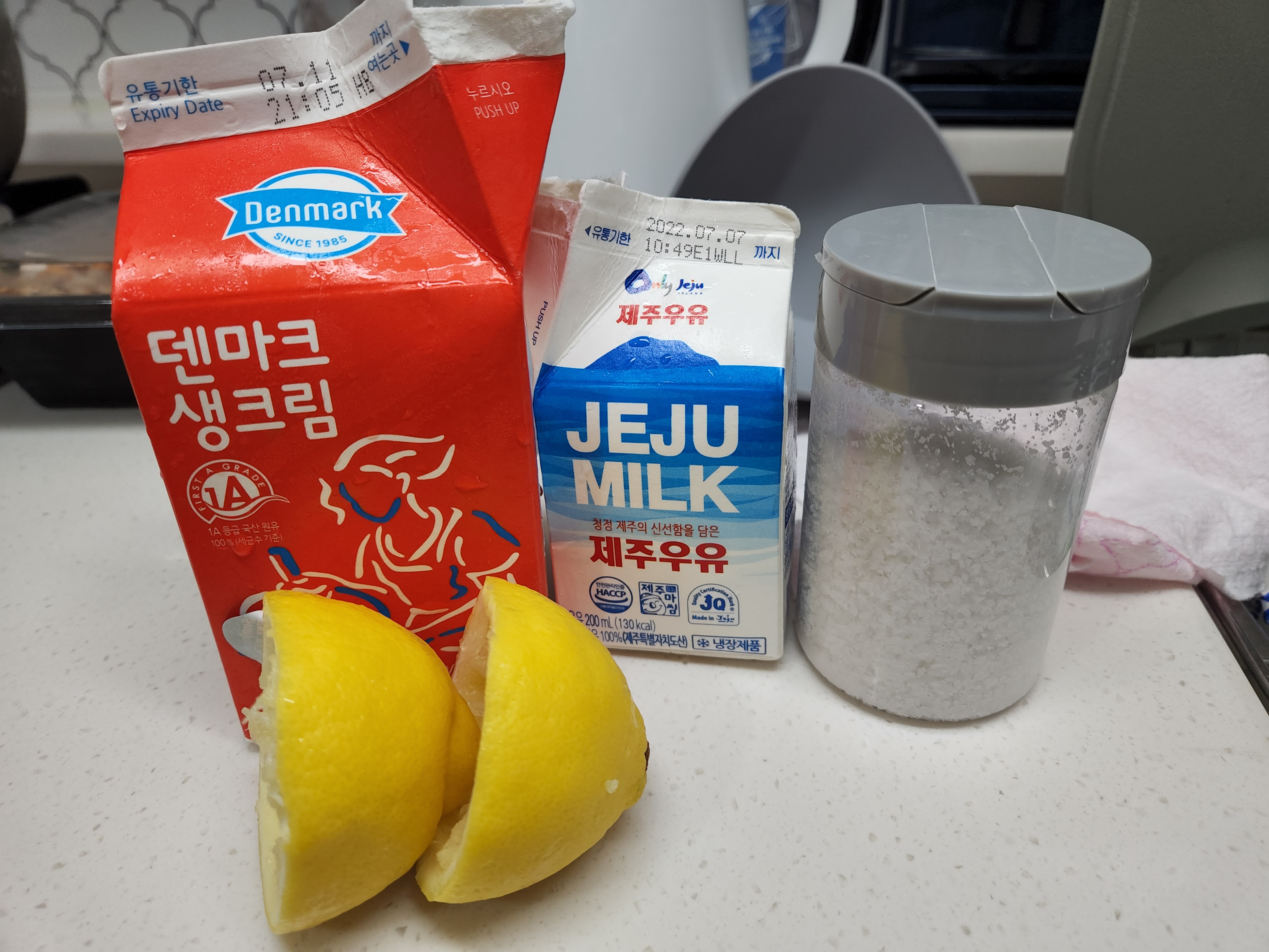소금, 레몬즙, 생크림, 우유를 한꺼번에 넣고 딱 처음만 수저로 휙휙 저어주세요.