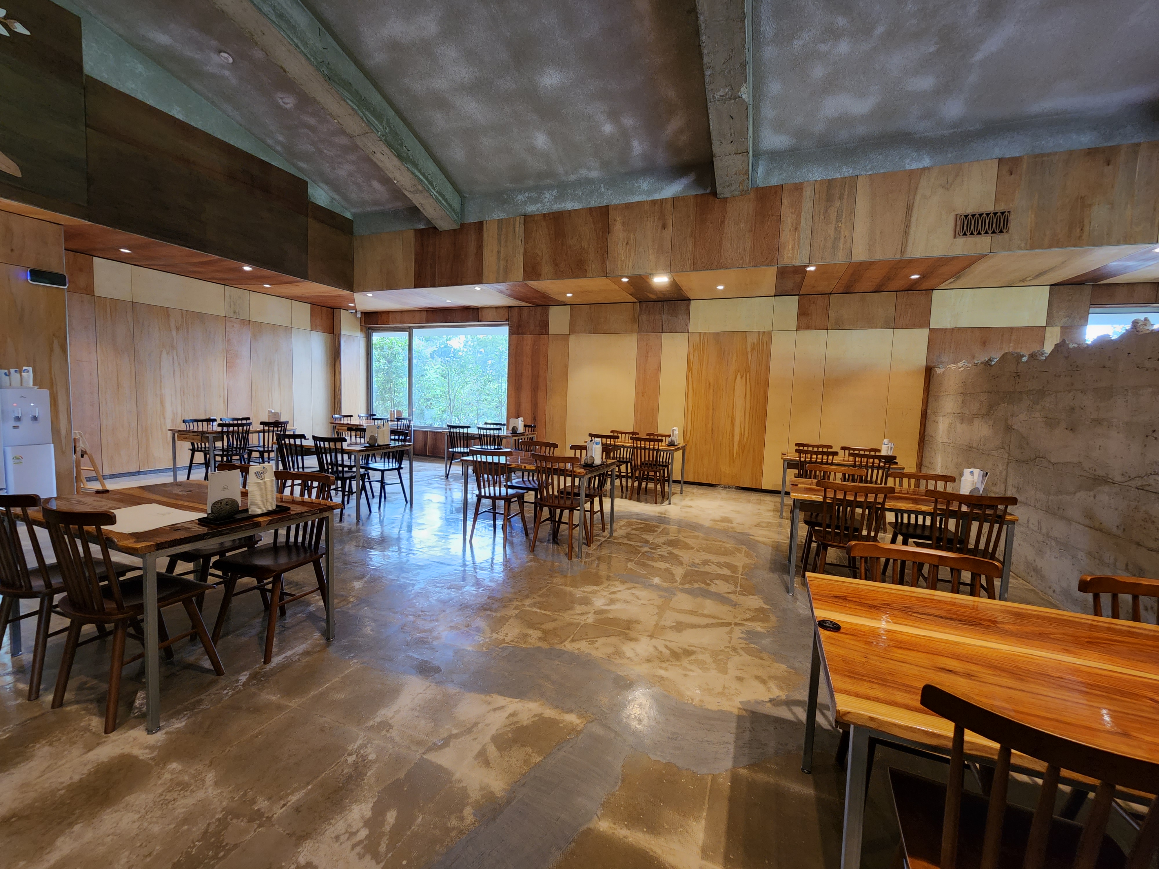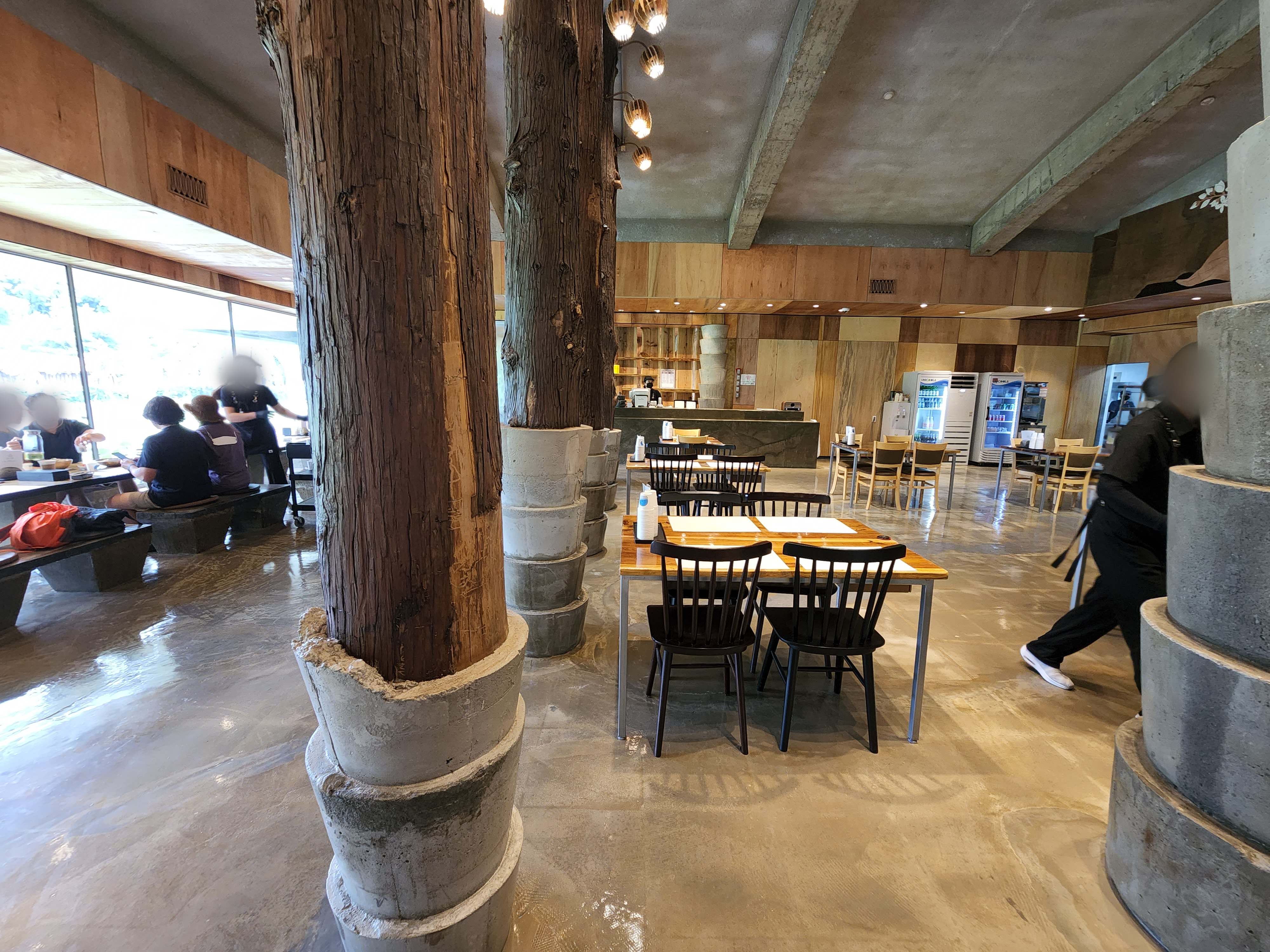 내부 인테리어가 상당히 특이했는데 에폭시 바닥과 시멘트받침대와 통나무를 연결시켜 기둥겸 인테리어 효과을 주고있더라고요.