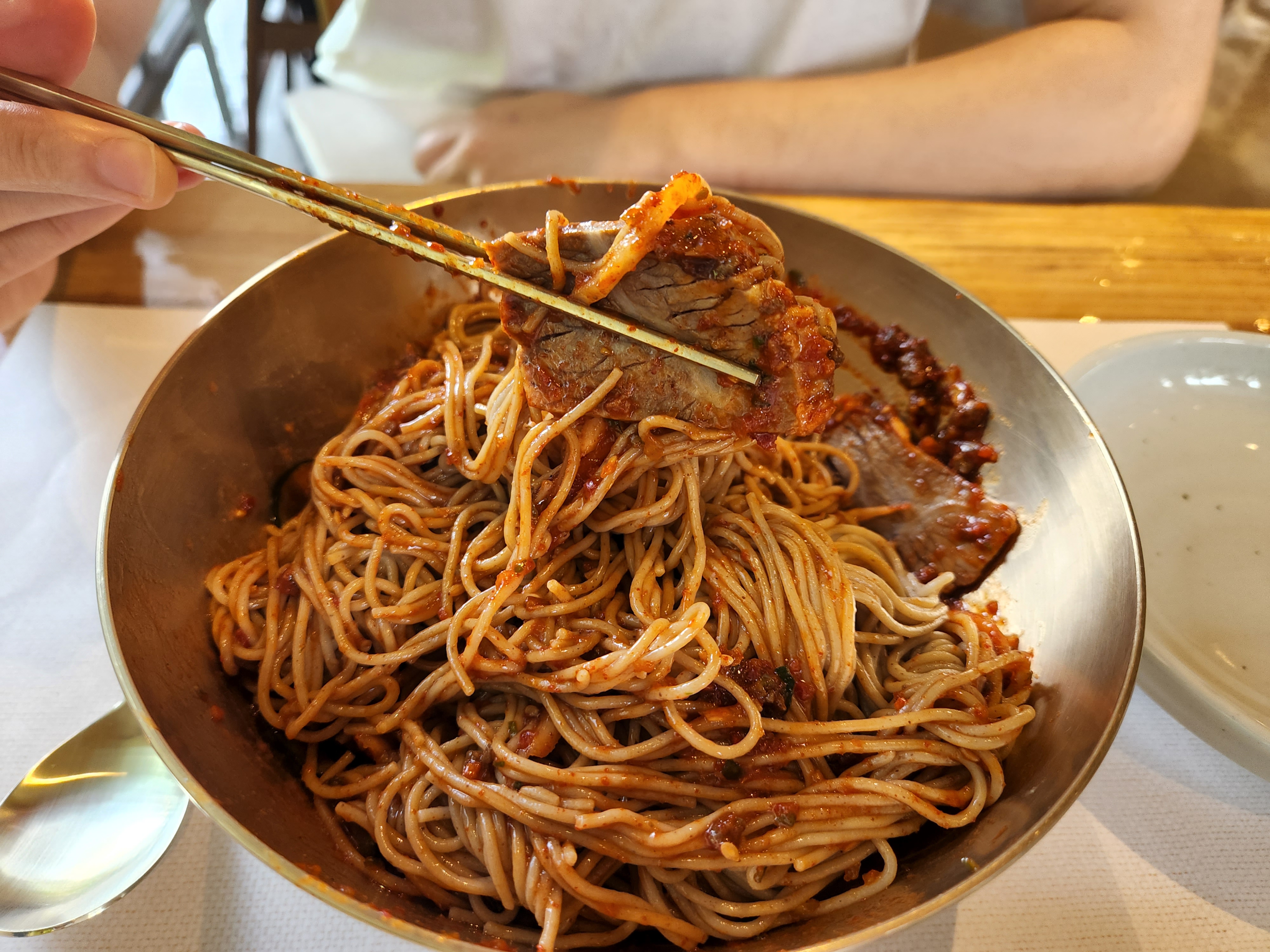 양념이 정말 많이 들어가 있지만 자극적이지 않은 비빔냉면 맛입니다.