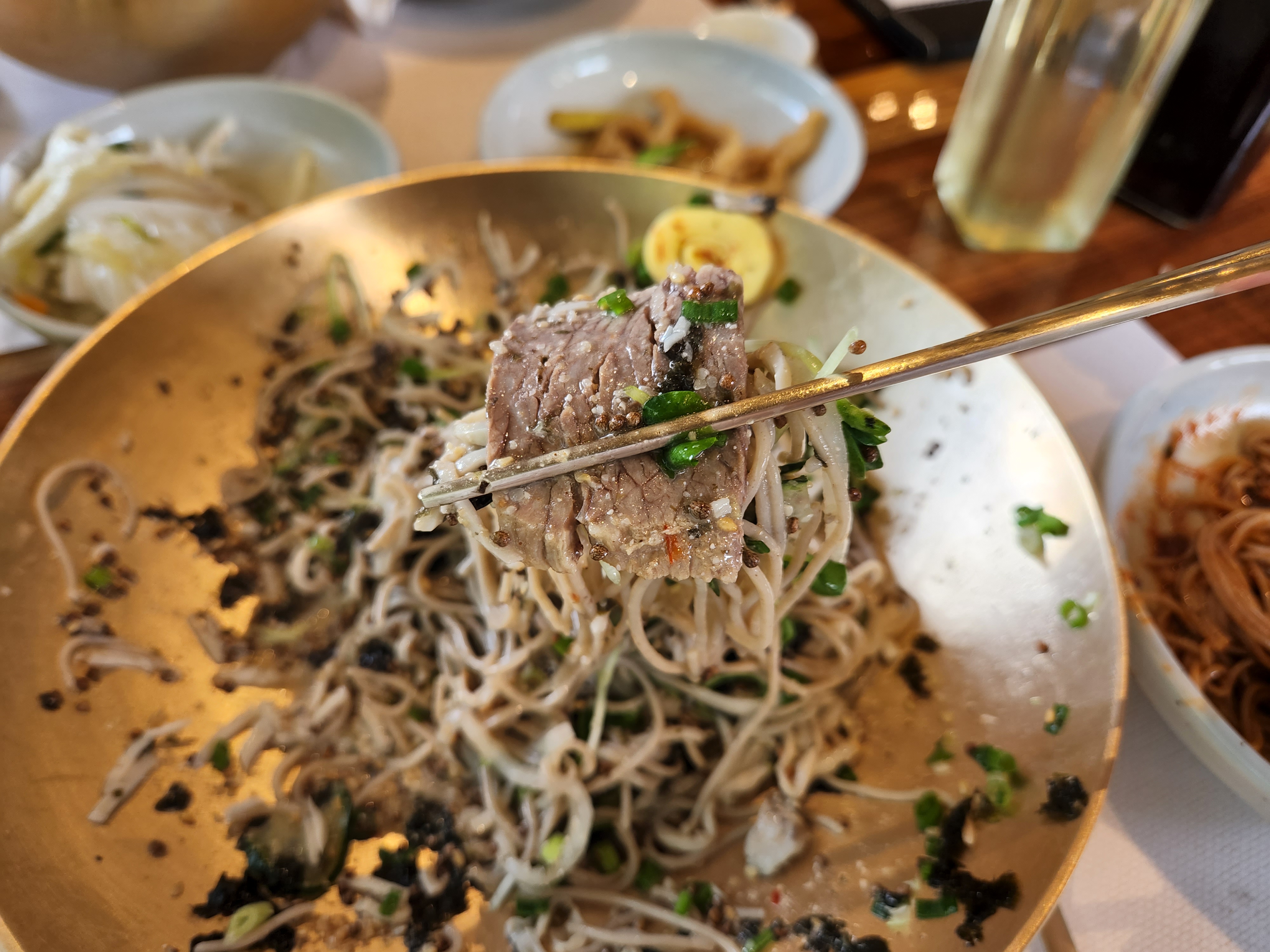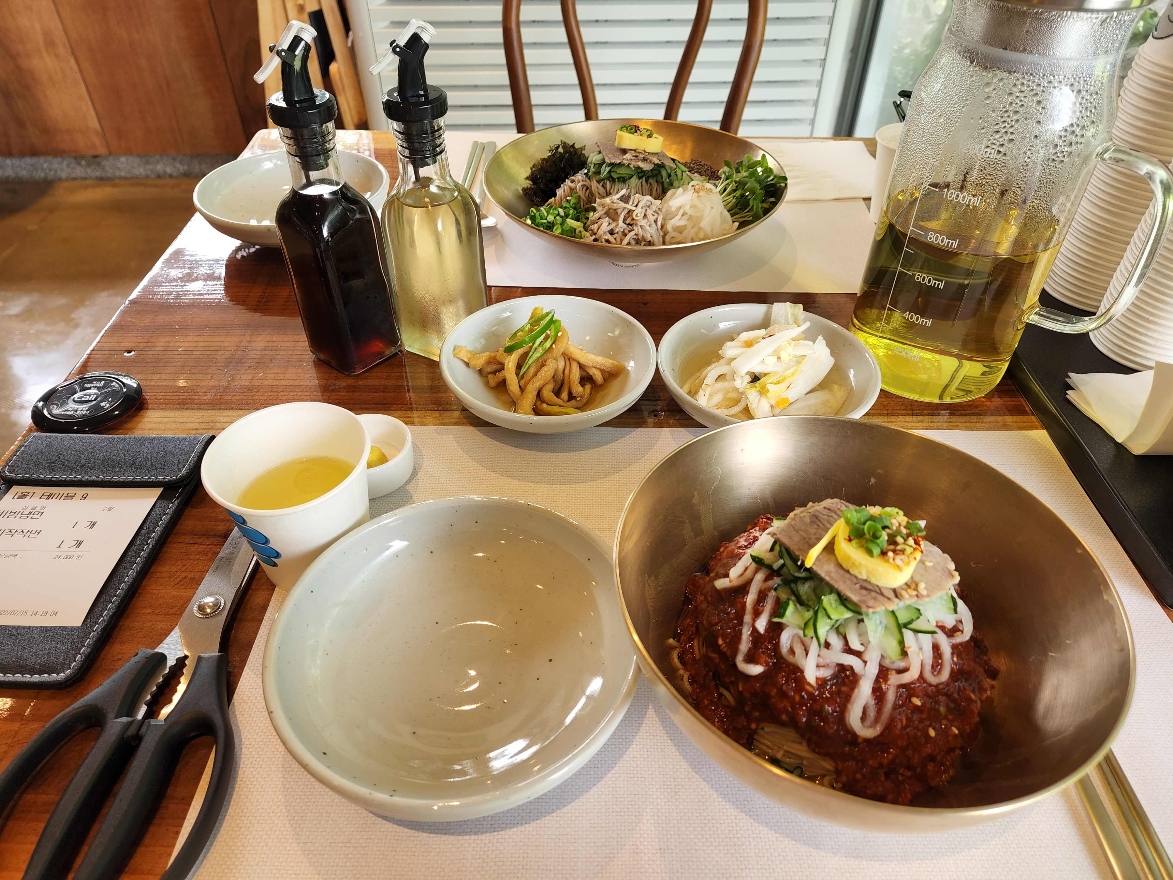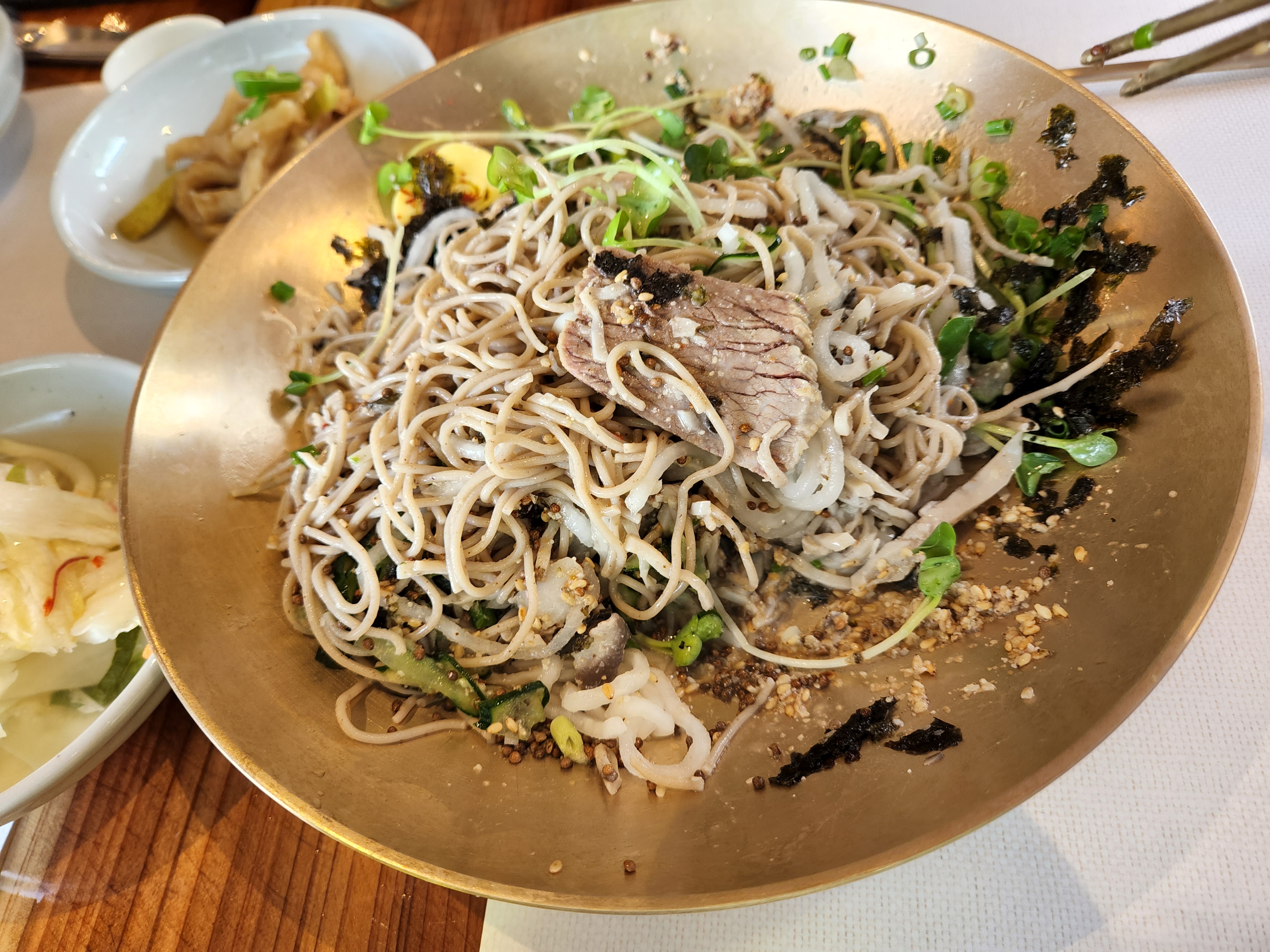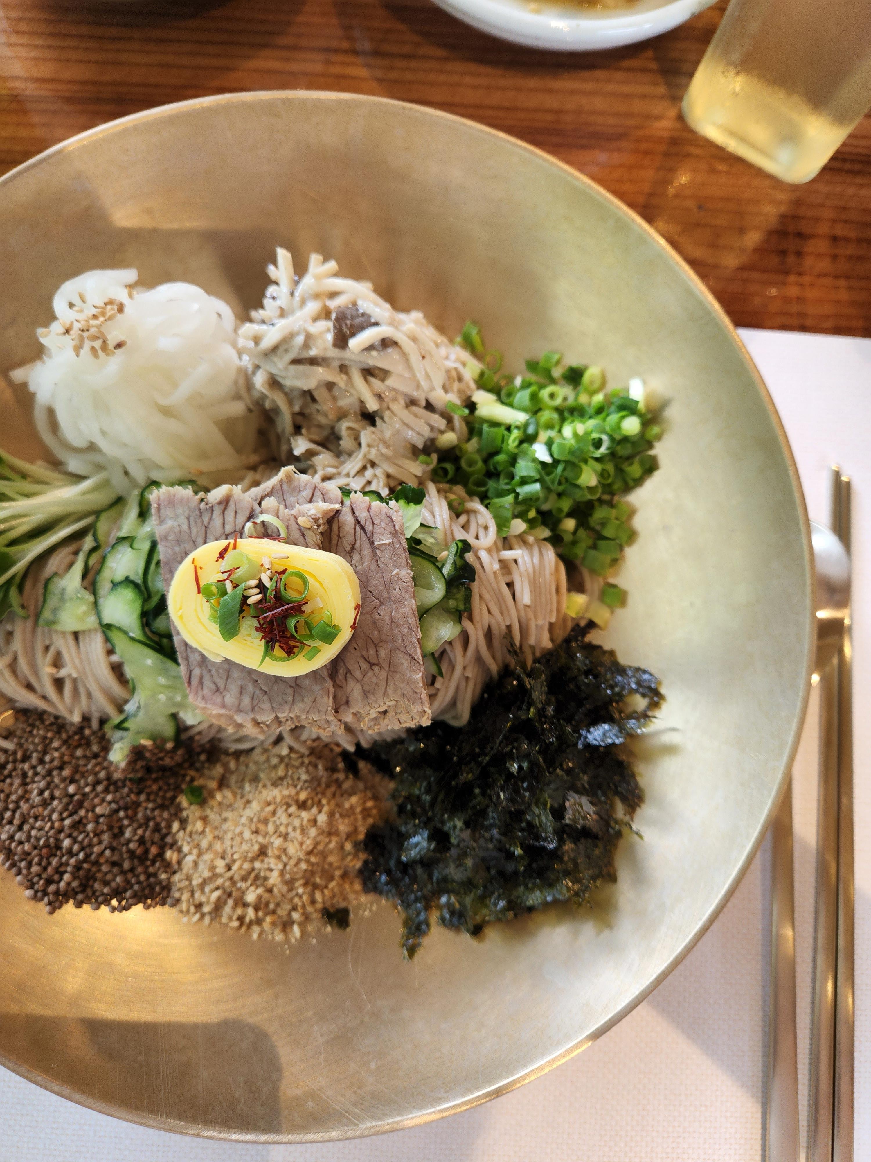 큰 그릇에 다양한 야채와 메밀면이 함께 올라와 있는데 보기만 해도 건강해지는 느낌입니다.