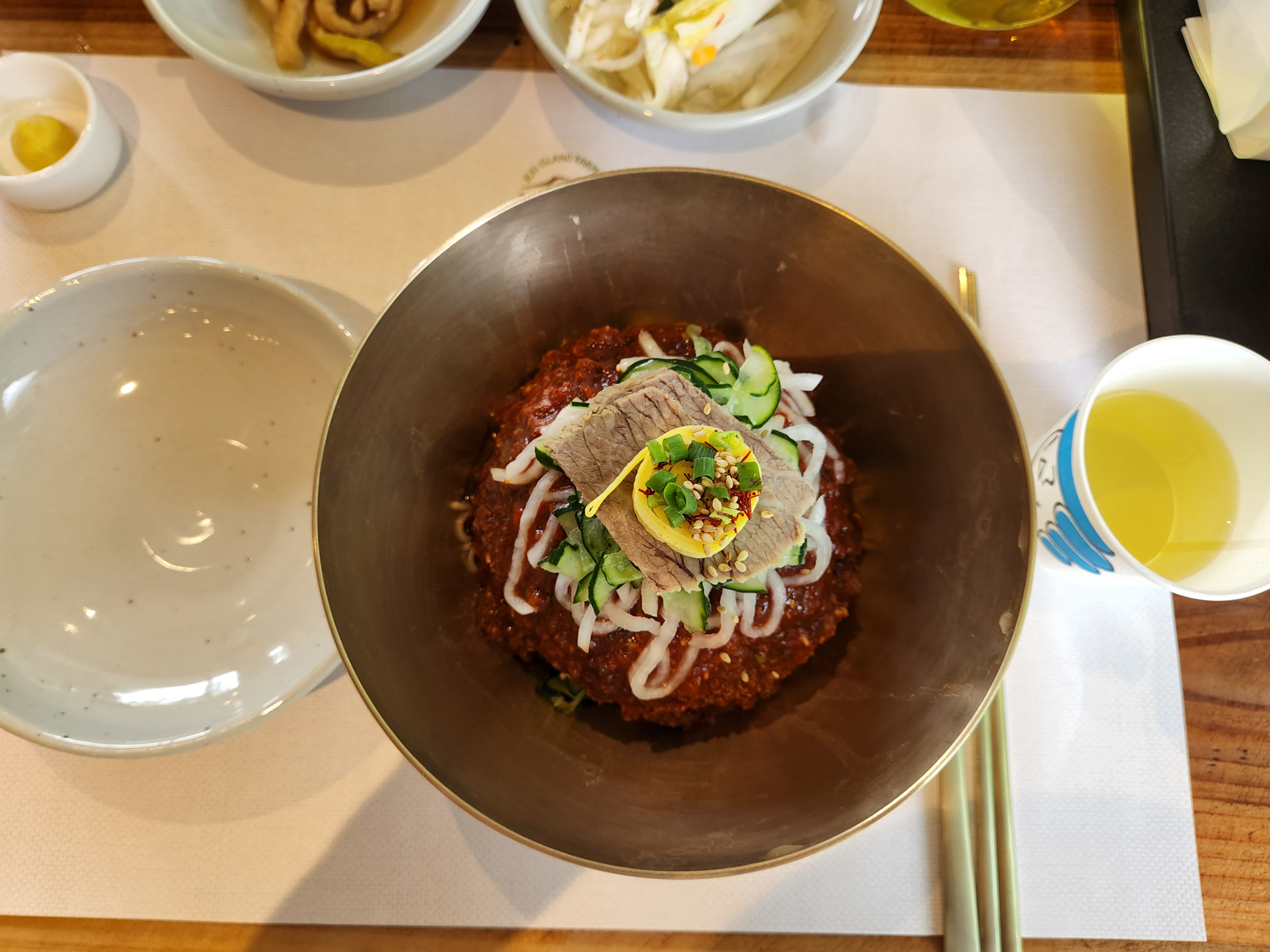 비빔냉면도 오이, 무, 쪽파, 양념장, 고기고명이 들어가 있어요.