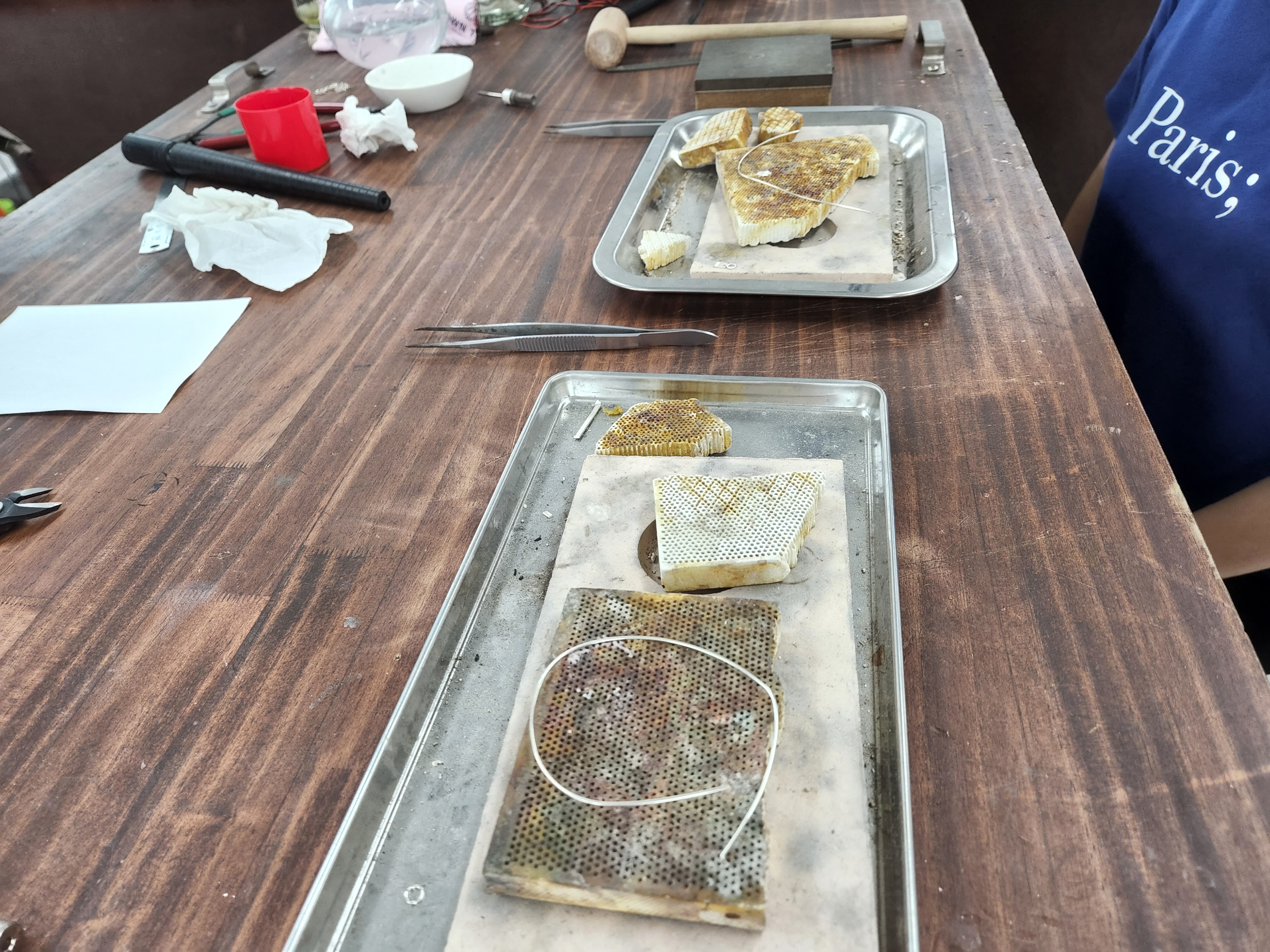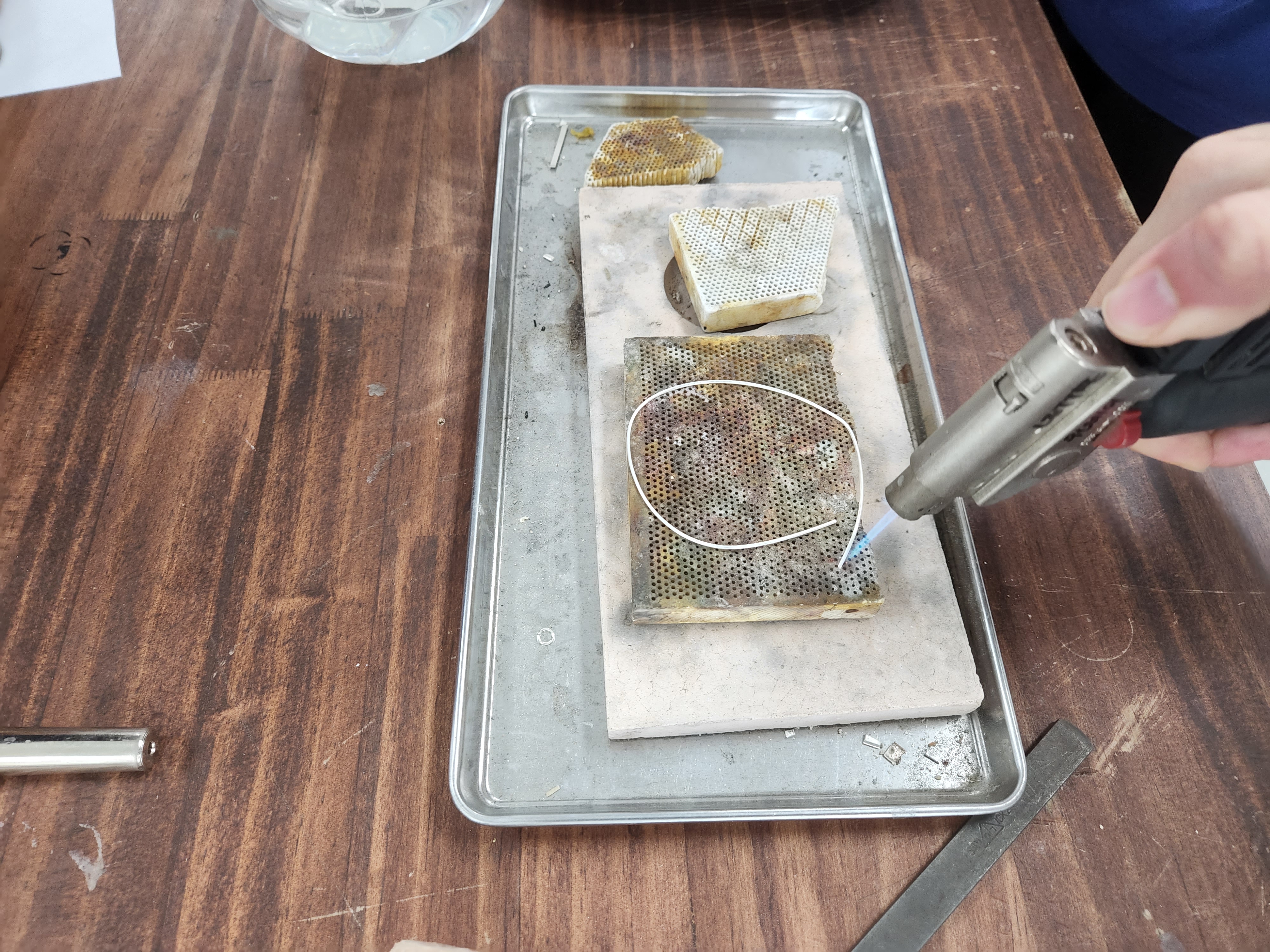 벌집모양의 판위에 팔찌를 만들 은을 올려놓고, 열을 가해 움직이기 쉽게 만들어줘요.