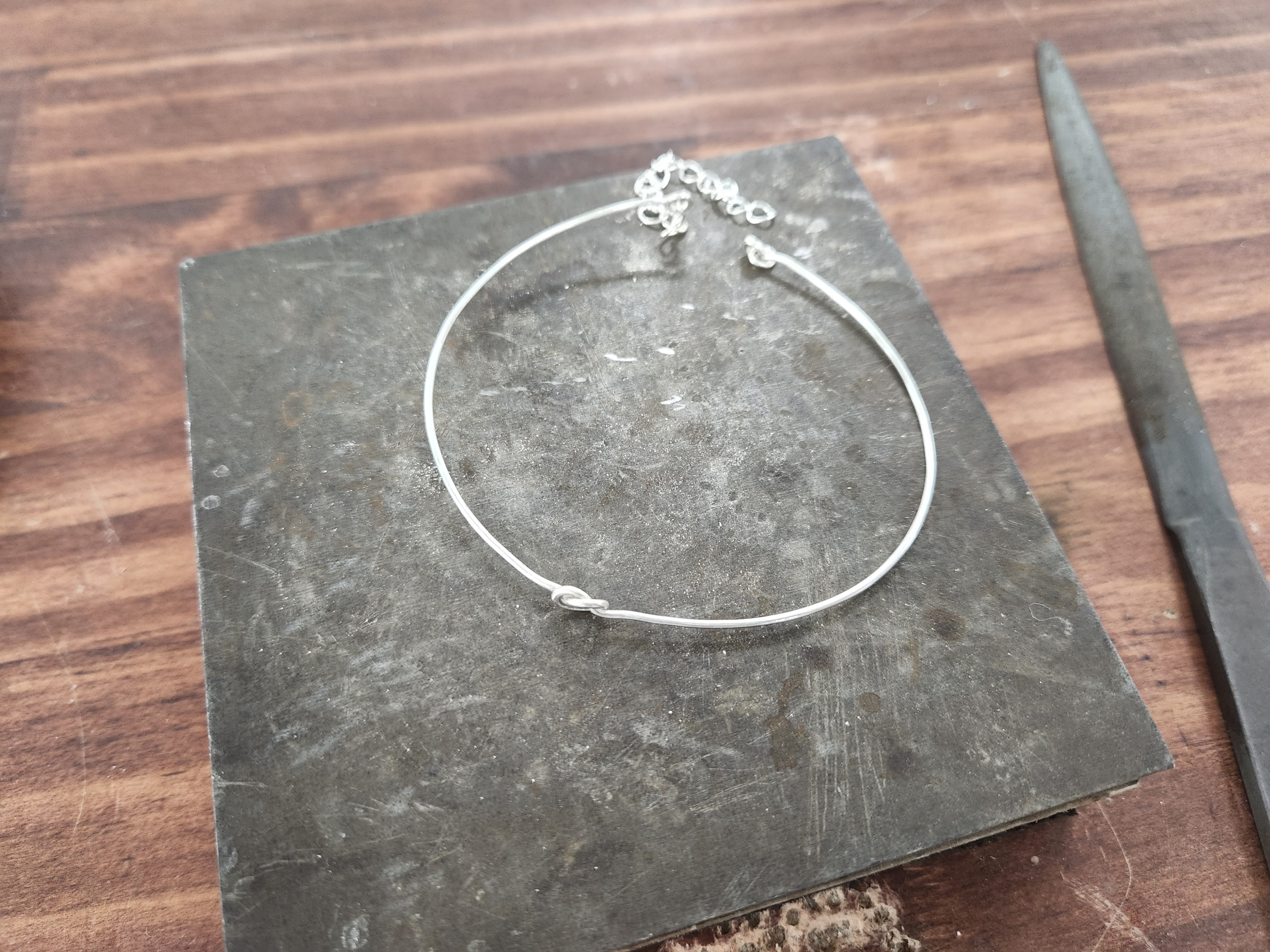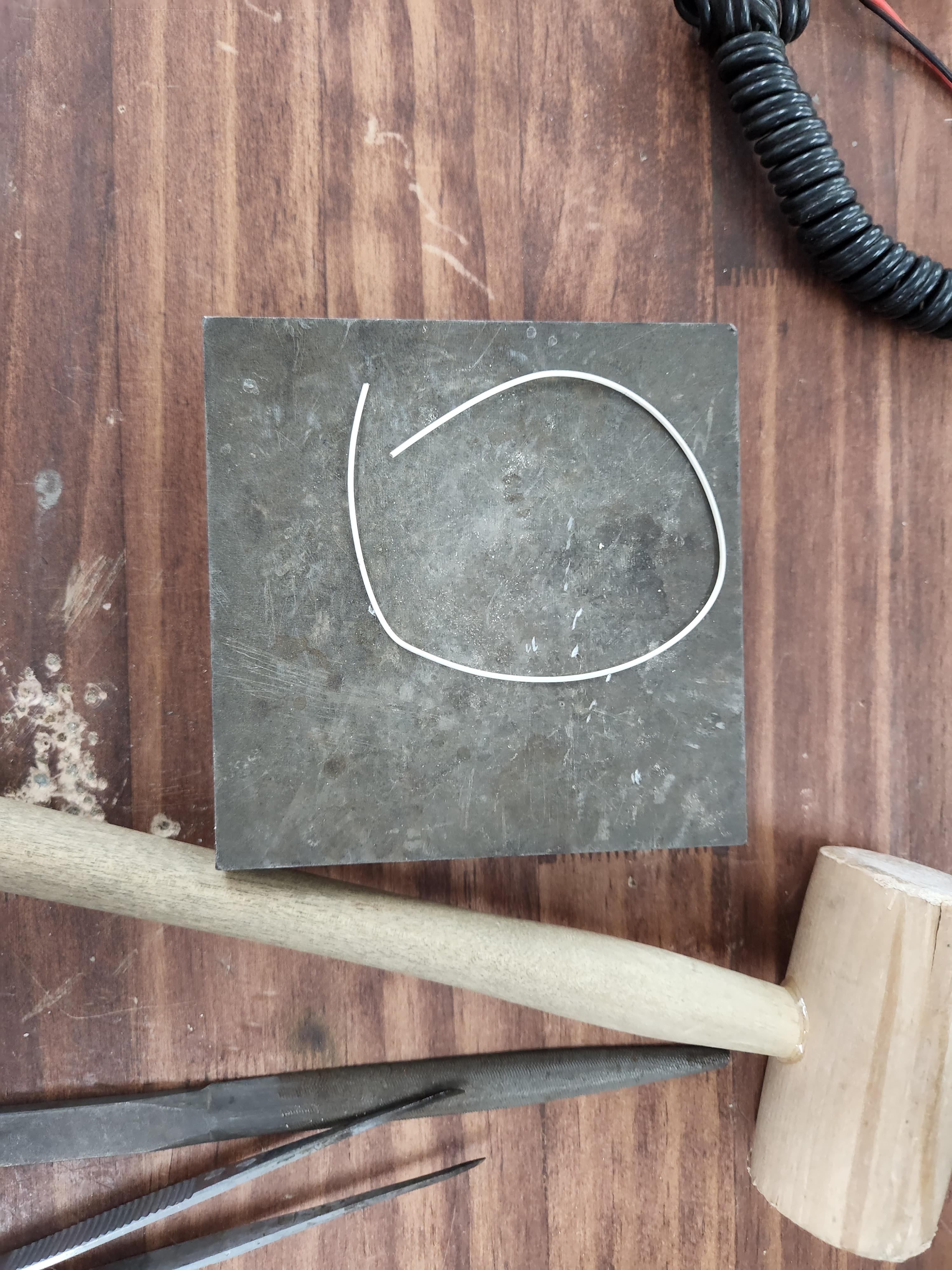 많이 구부러졌다고 생각되면, 다시 일자로 펴서 열심히 두드려주며 은을 펴요.