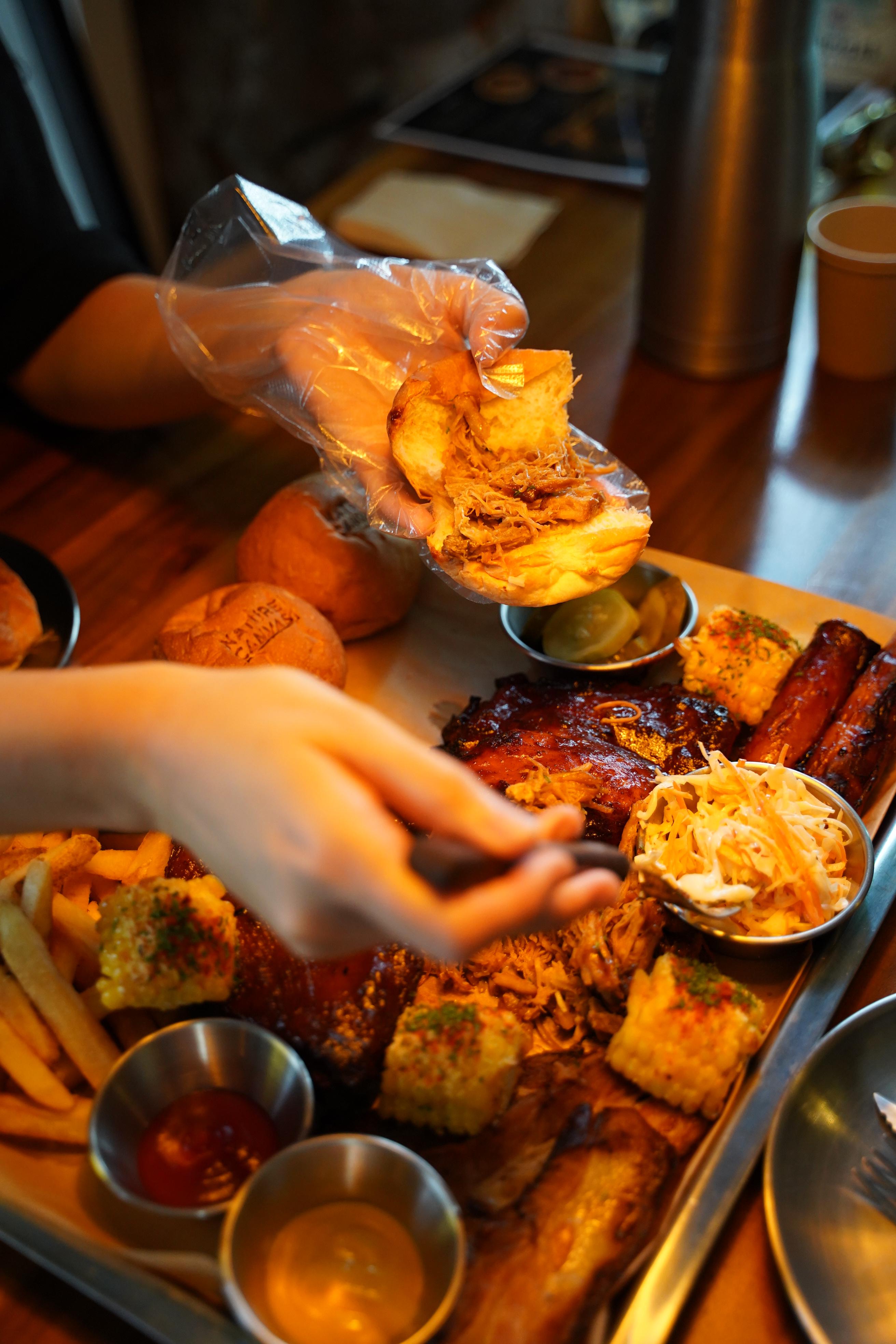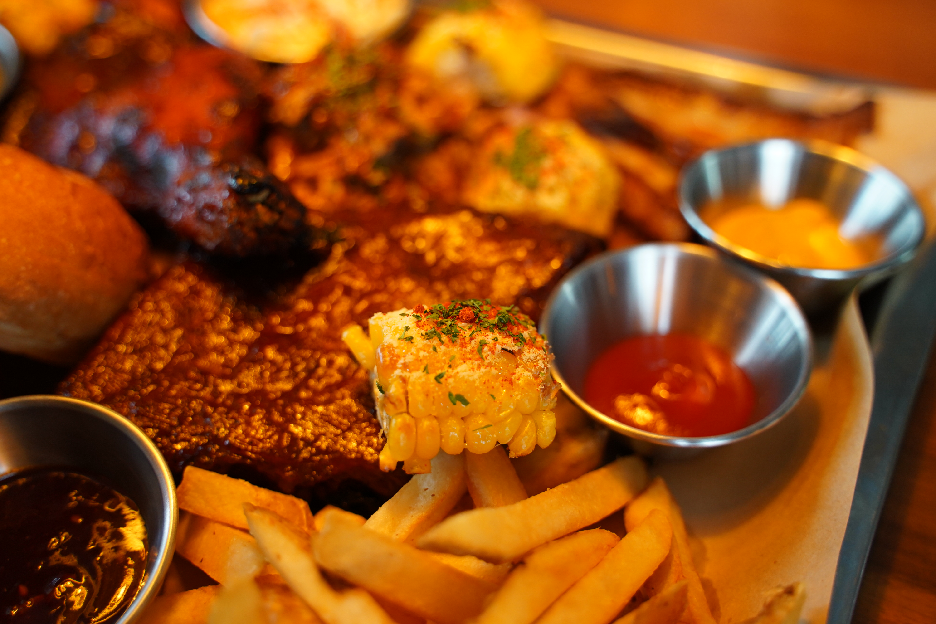 소시지, 폴드포크, 치킨, 베이컨, 베이비백립, 감자튀김, 옥수수 가 들어간 비비큐플래터는 2인이 먹기에 양도 넉넉하고
