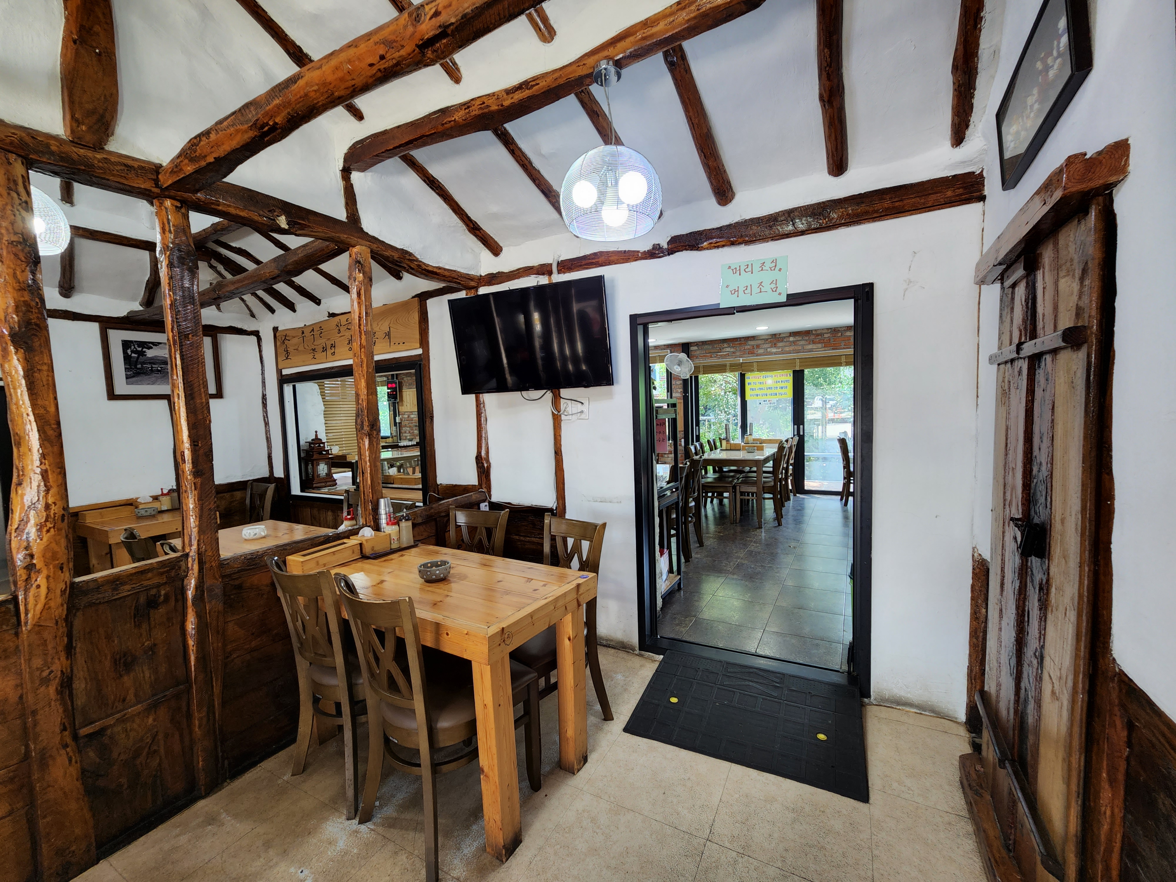 한쪽은 나무느낌의 인테리어이고 다른 한쪽은 또 다른 식당 느낌이에요.