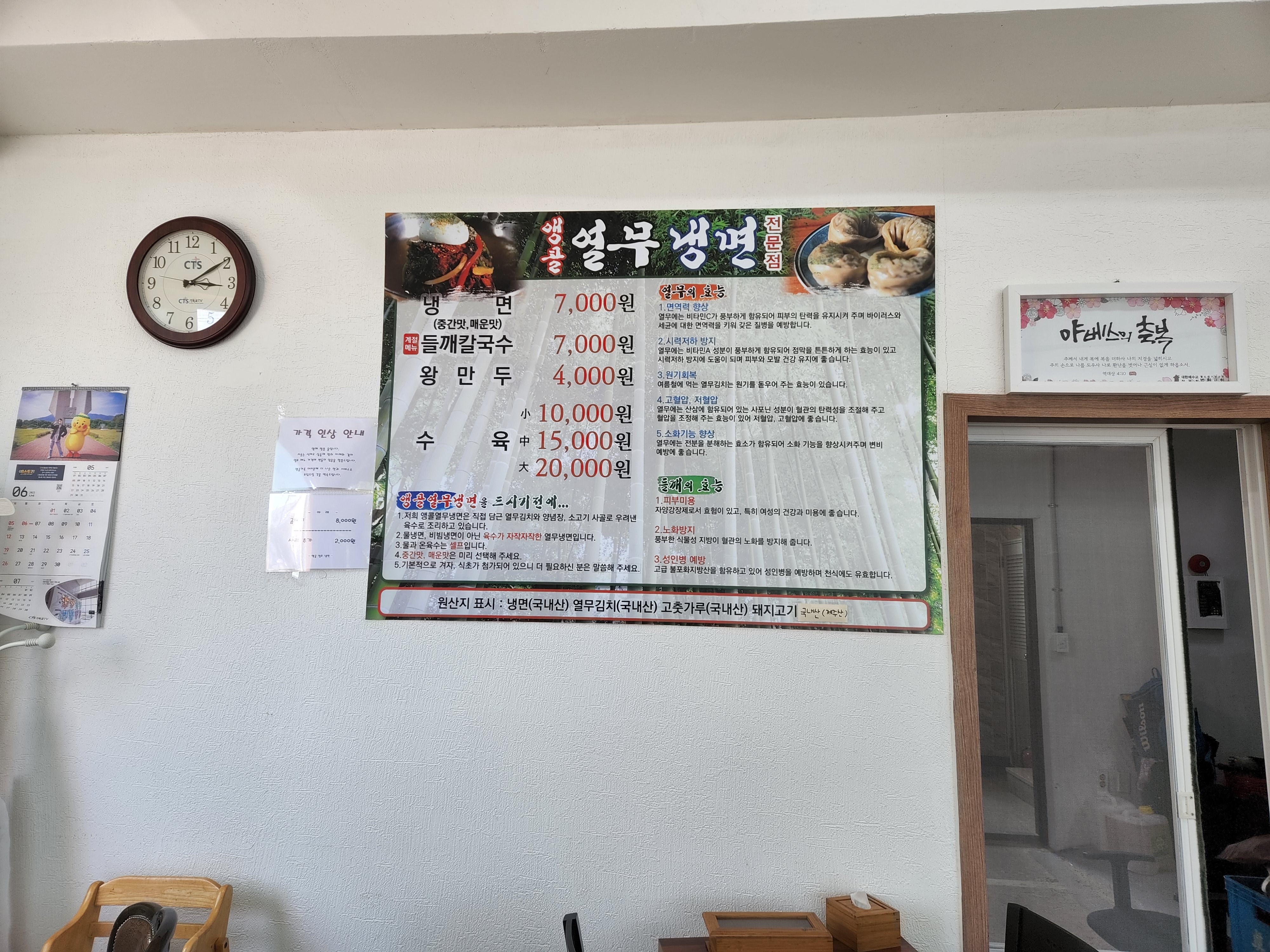 단일메뉴로 열무냉면 7천원이고, 계절메뉴로 들깨칼국수가 있어요.