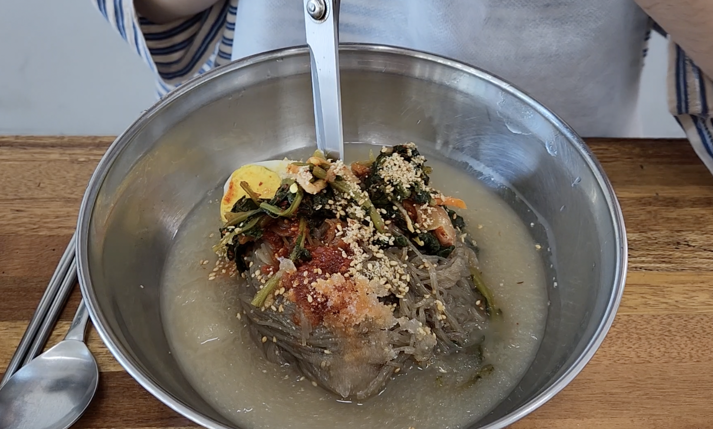 가위로 먹기 좋게 잘라 섞어서 먹으면 꿀맛이에요.