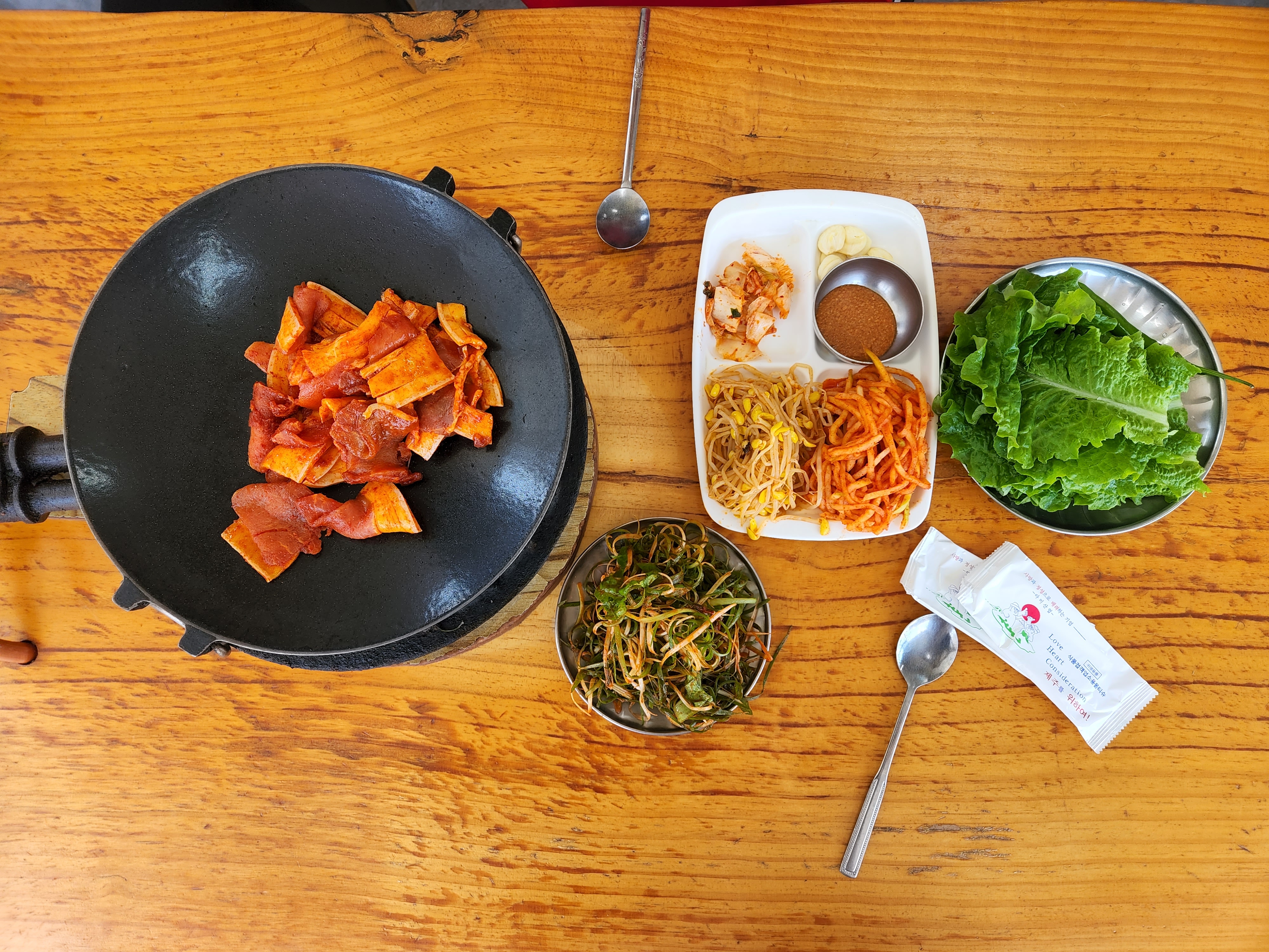 양념된 두루치기 2인분과 콩나물, 무채, 파채, 상추가 함께 나옵니다. (밥+국)