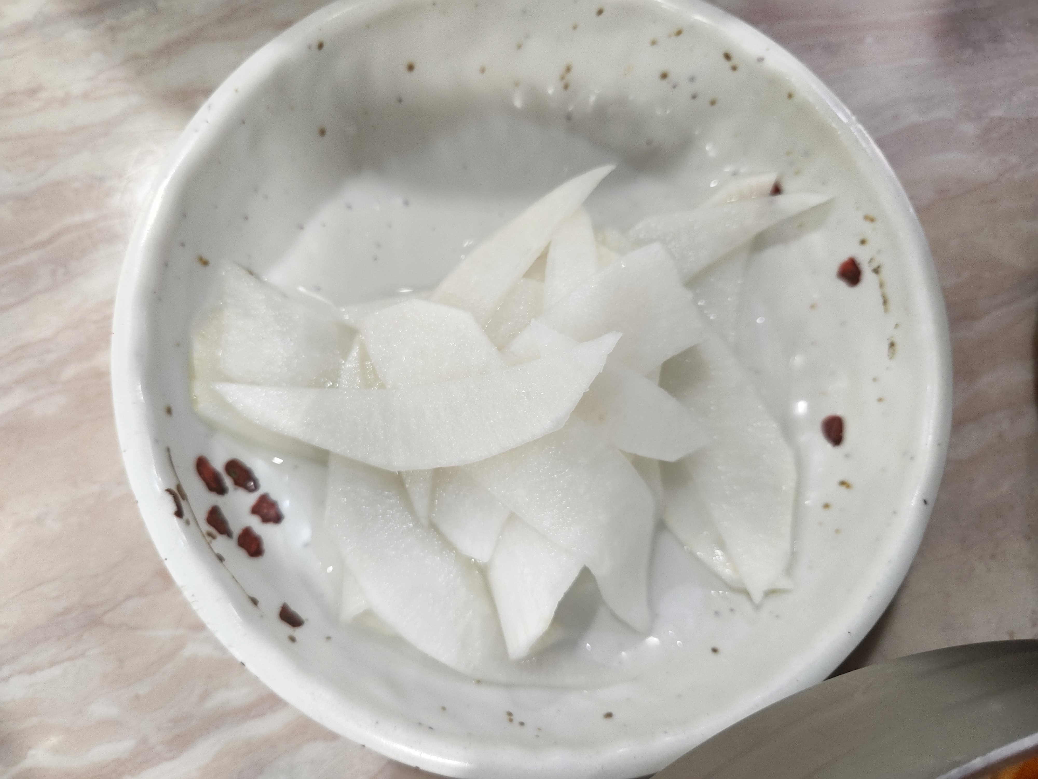 반찬은 무절임하나이고, 물과 온육수는 셀프입니다.