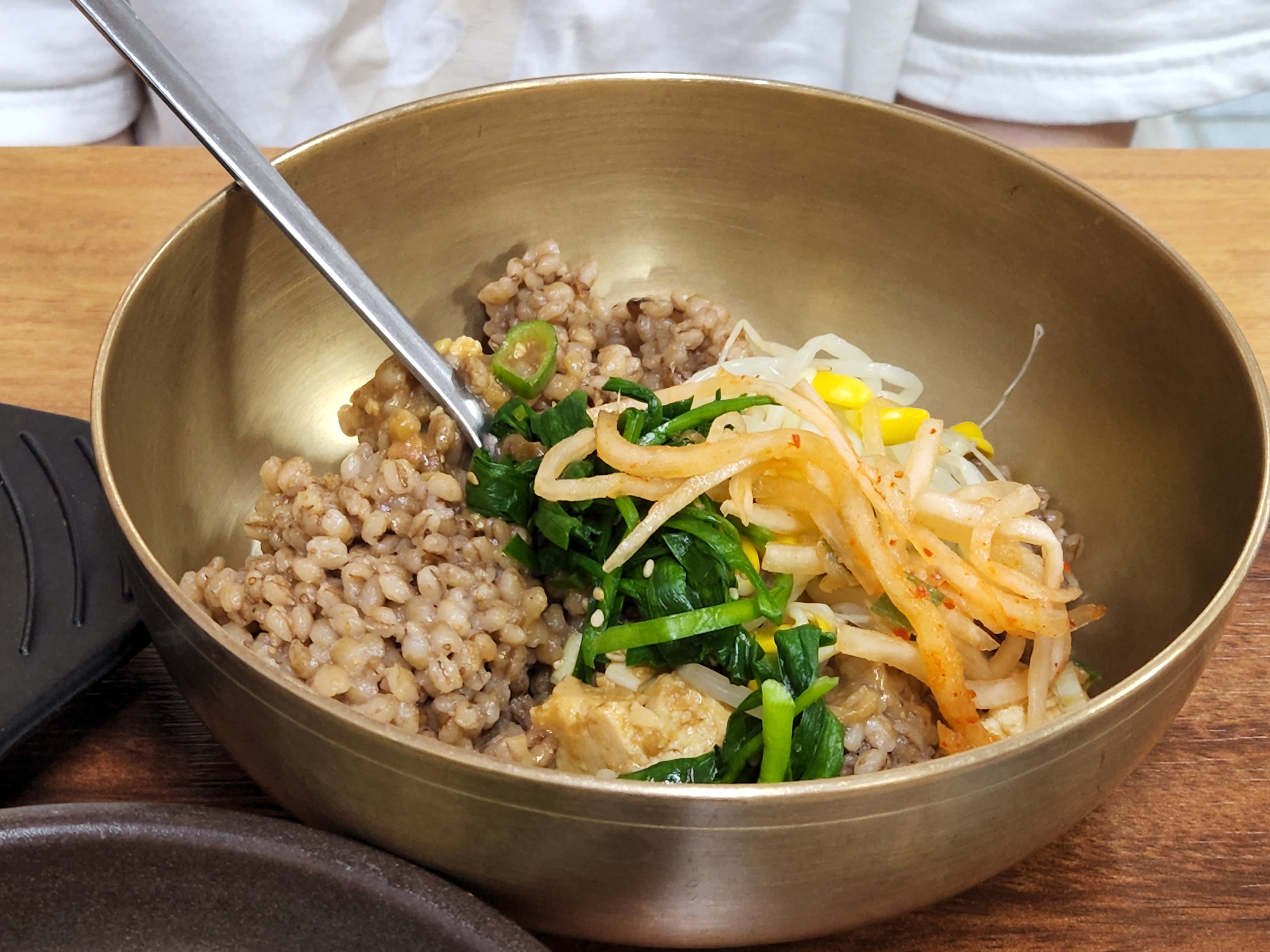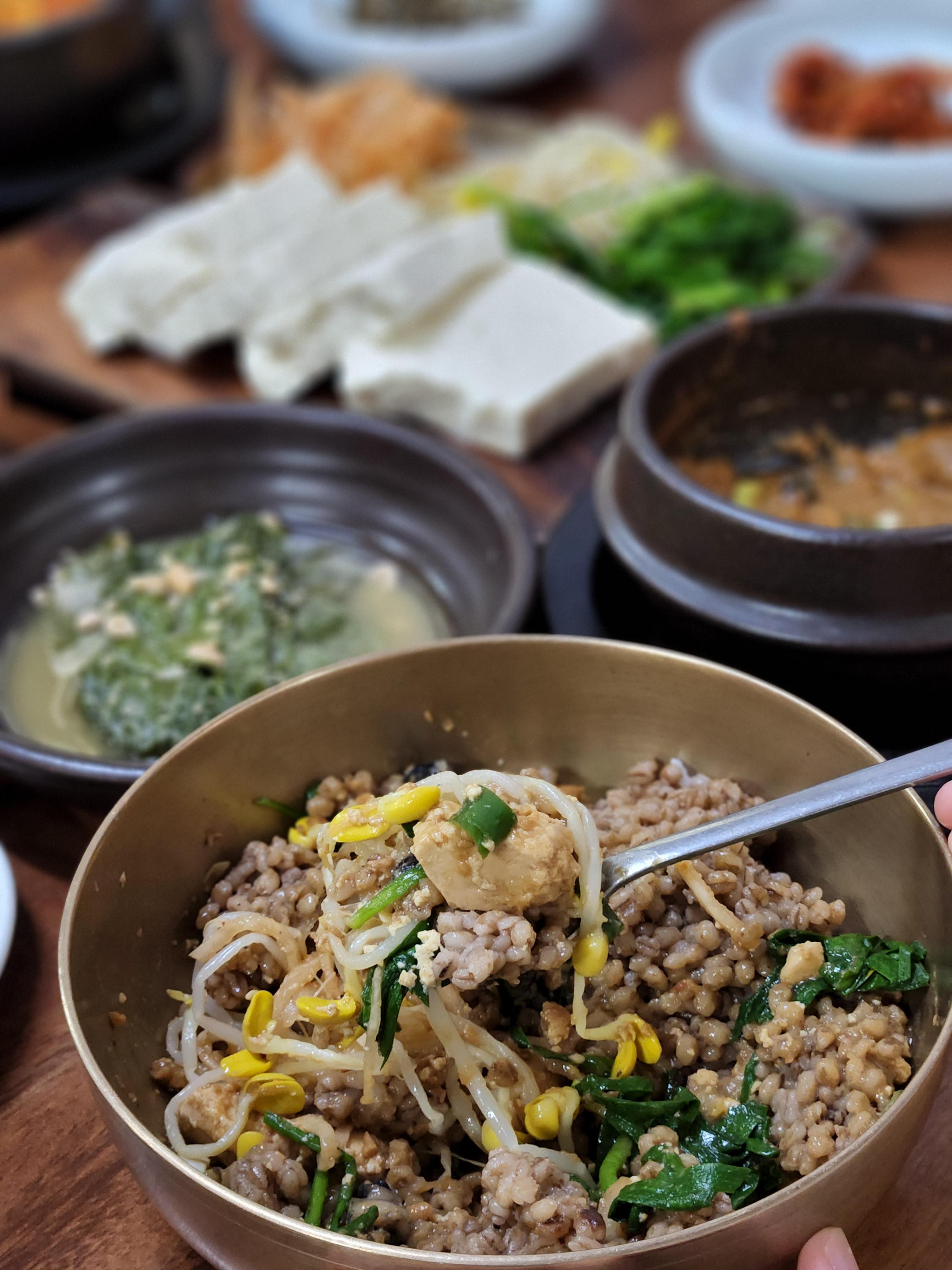 보리밥에 우렁강된장을 넣고 무생채, 부추, 콩나물을 함께 넣어 비벼먹으면 정말 꿀맛이에요.