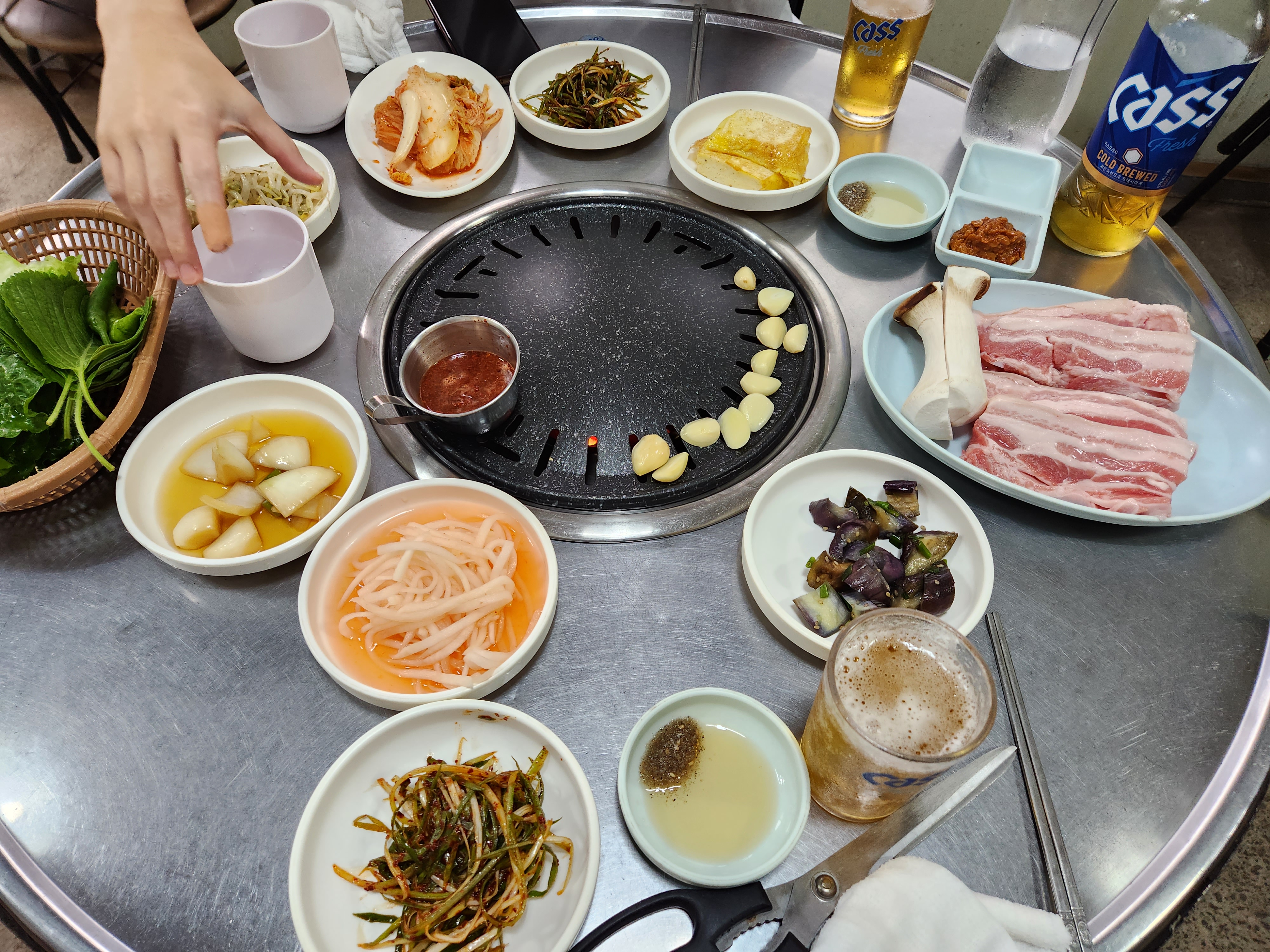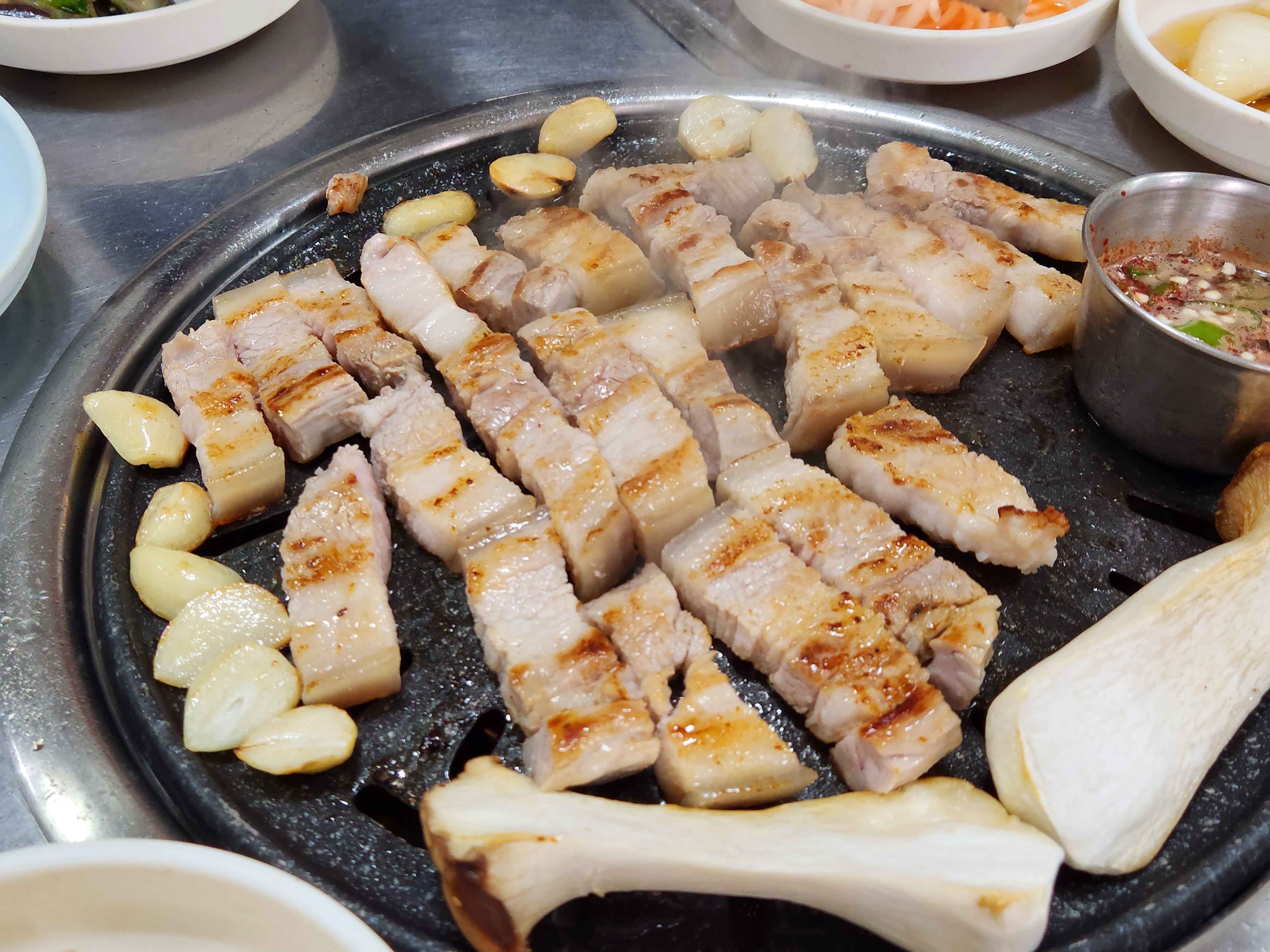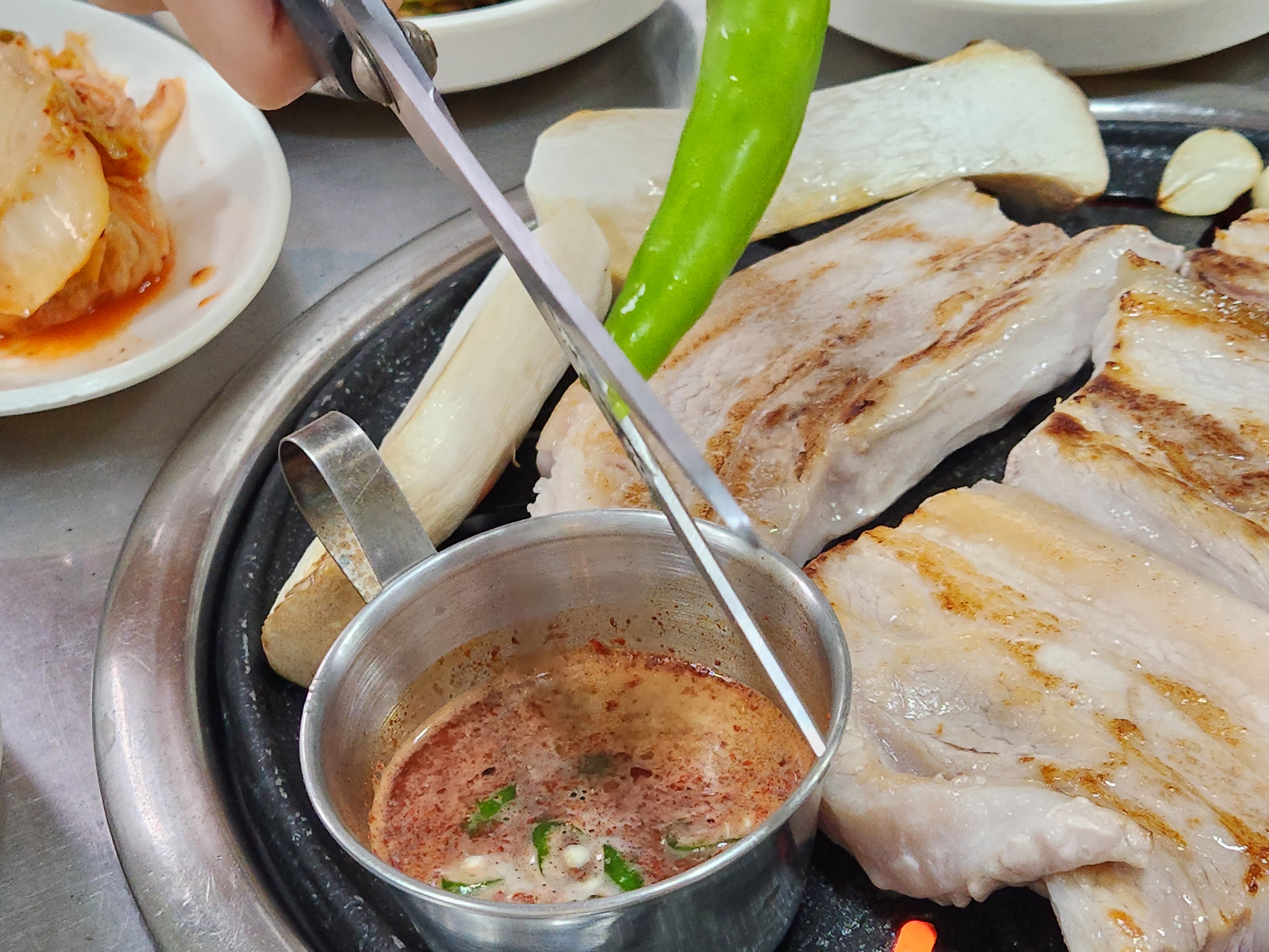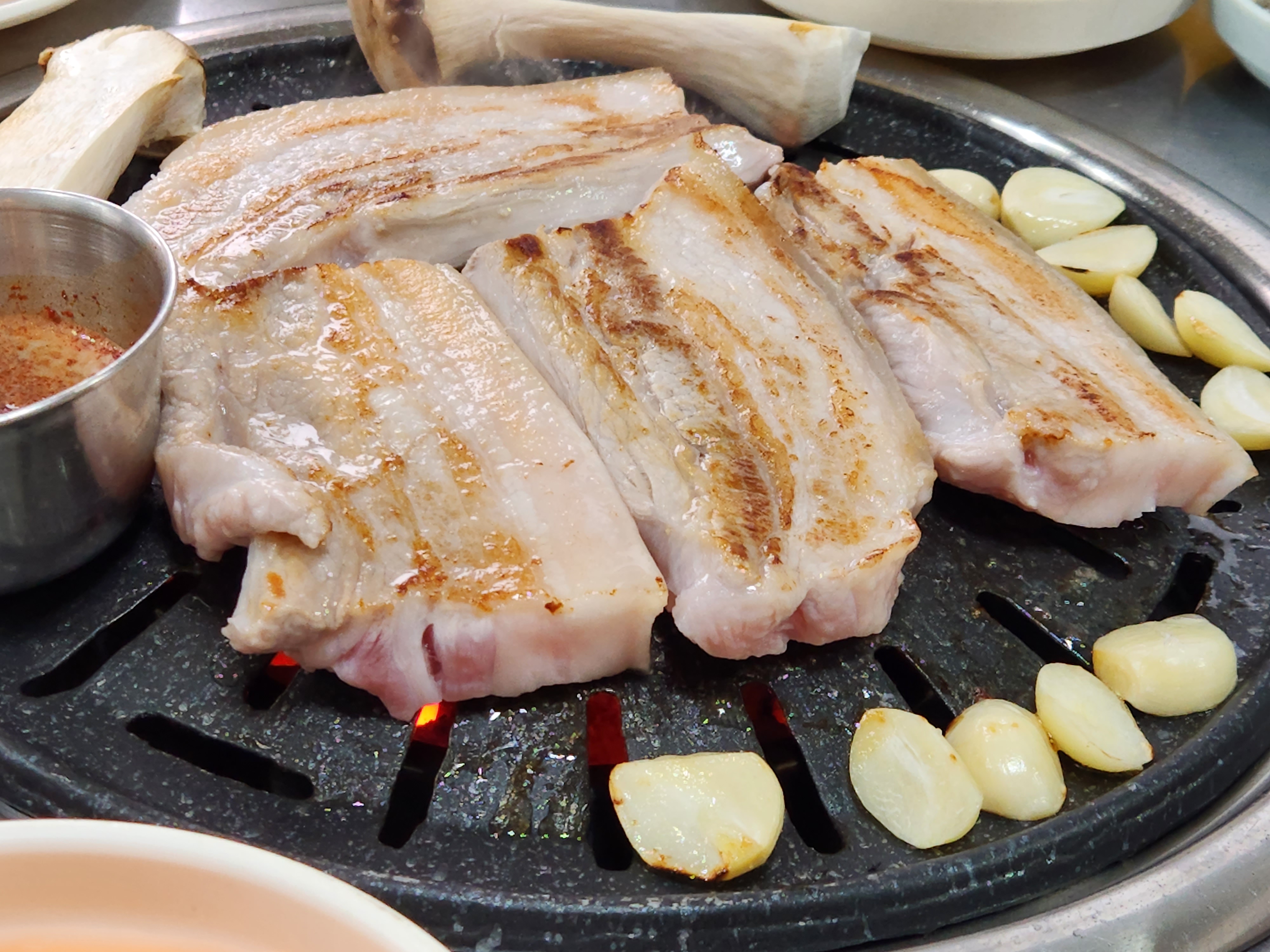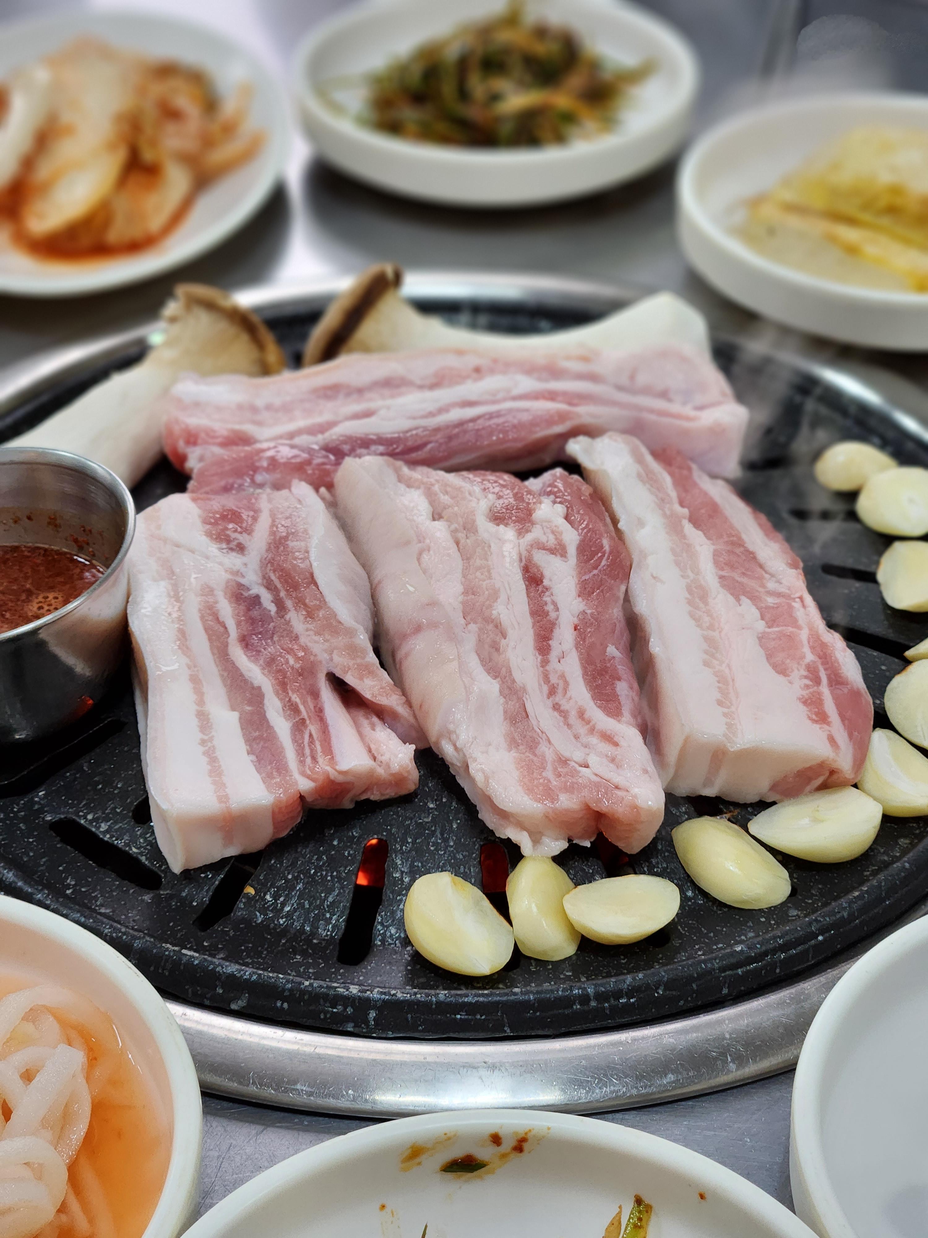 열이 잘 오른 불판에 오겹살을 올리니 금방금방 잘 익더라고요.