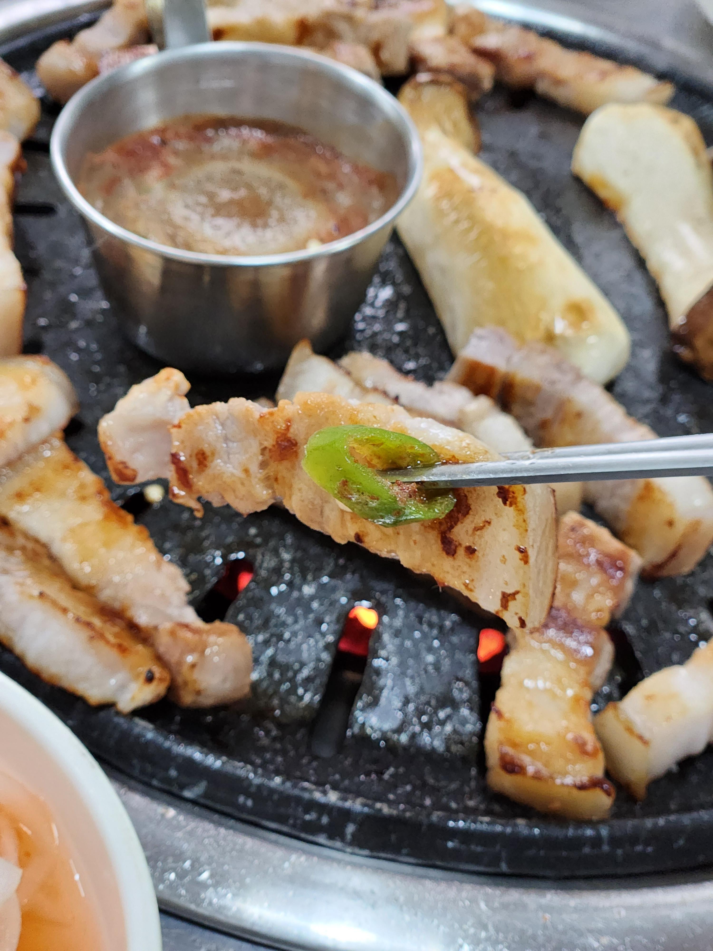 제주 오겹살 맛집에서는 숯불과 불판을 이용하여 굽는데, 이왕 숯불로 열을 가하는거면 판이 아닌 숯불로 구웠다면 더 맛있었을것 같아요.