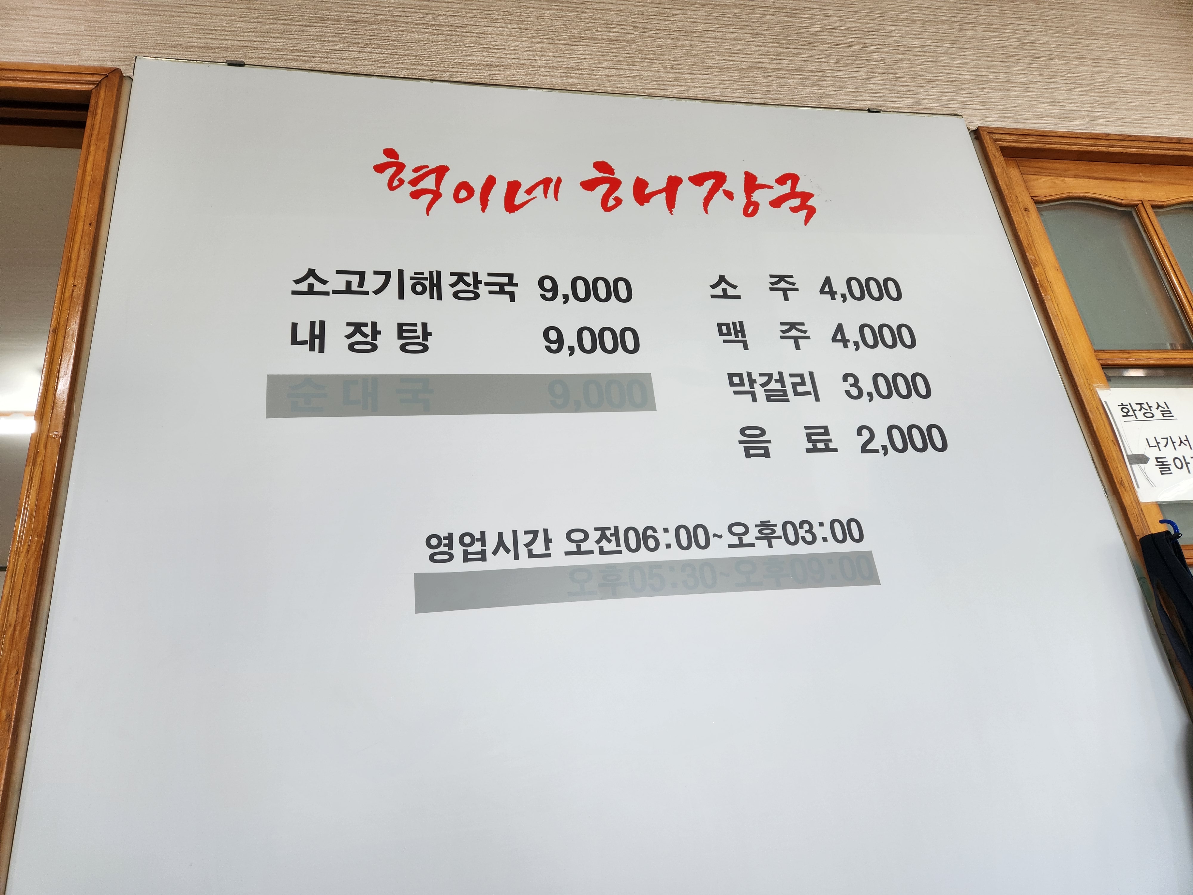 중문에는 선지해장국이 1만원인데, 이곳은 9천원이에요.
