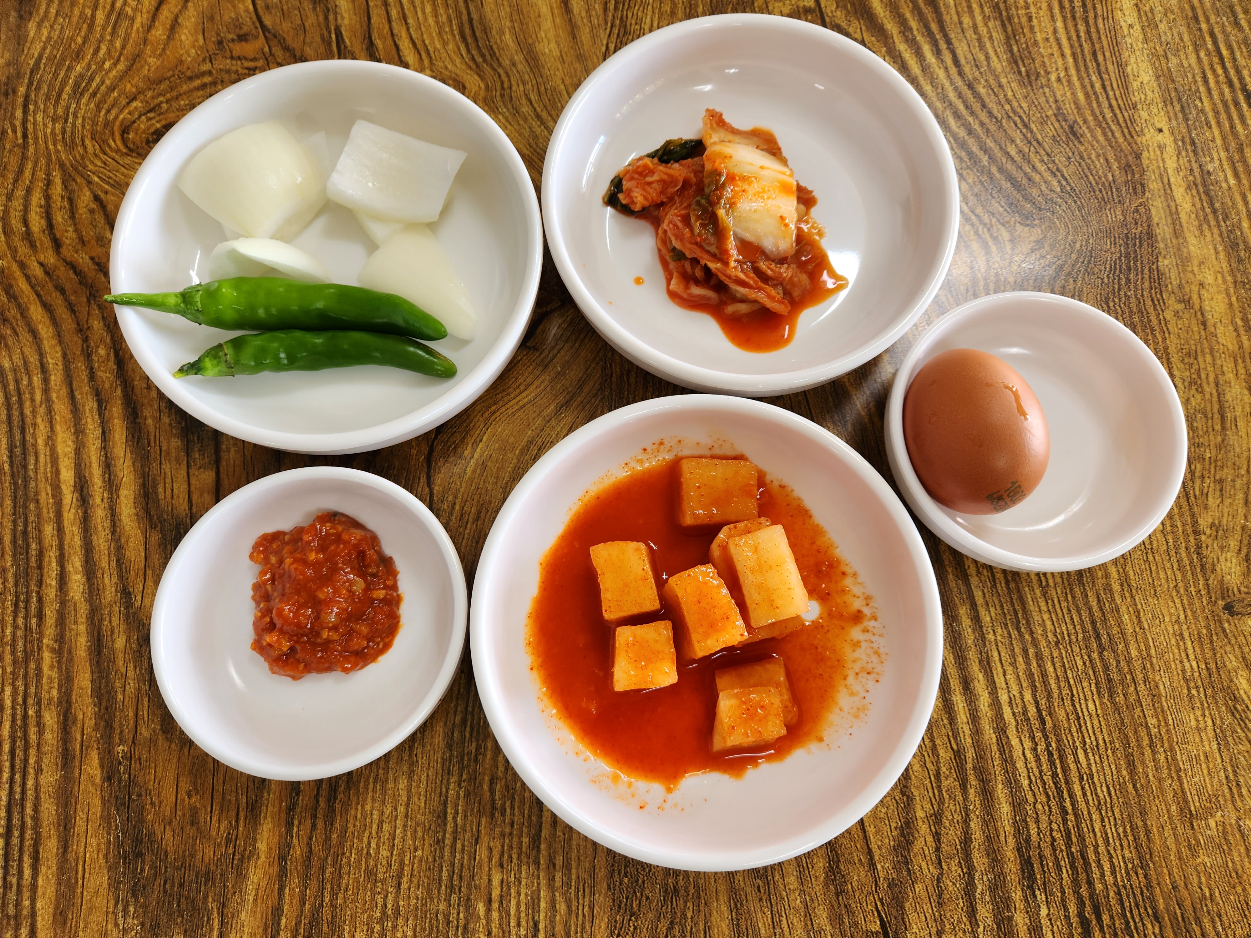 고추, 양파, 김치, 깍두기 기본 제주 해장국 맛집의 반찬입니다.