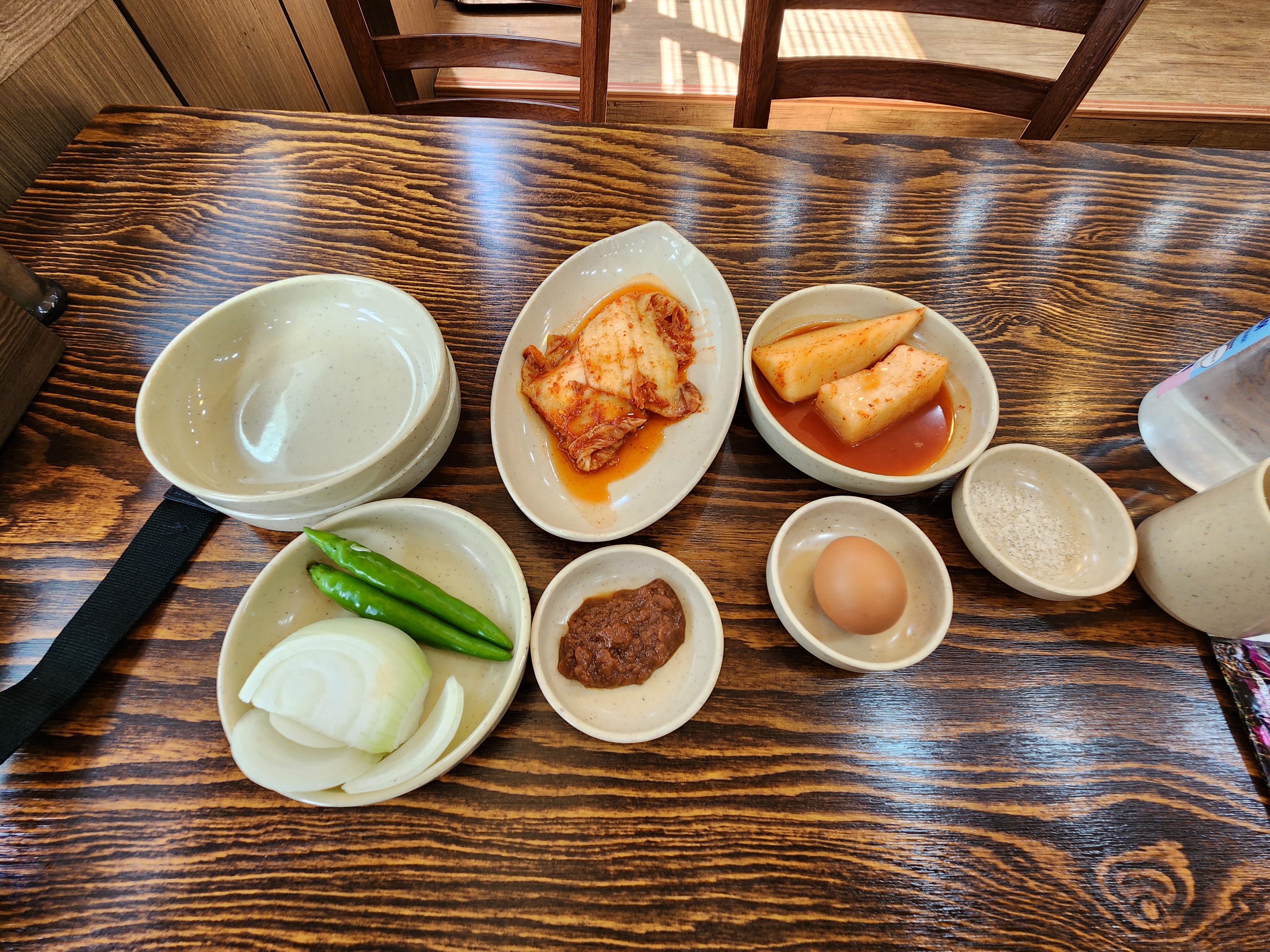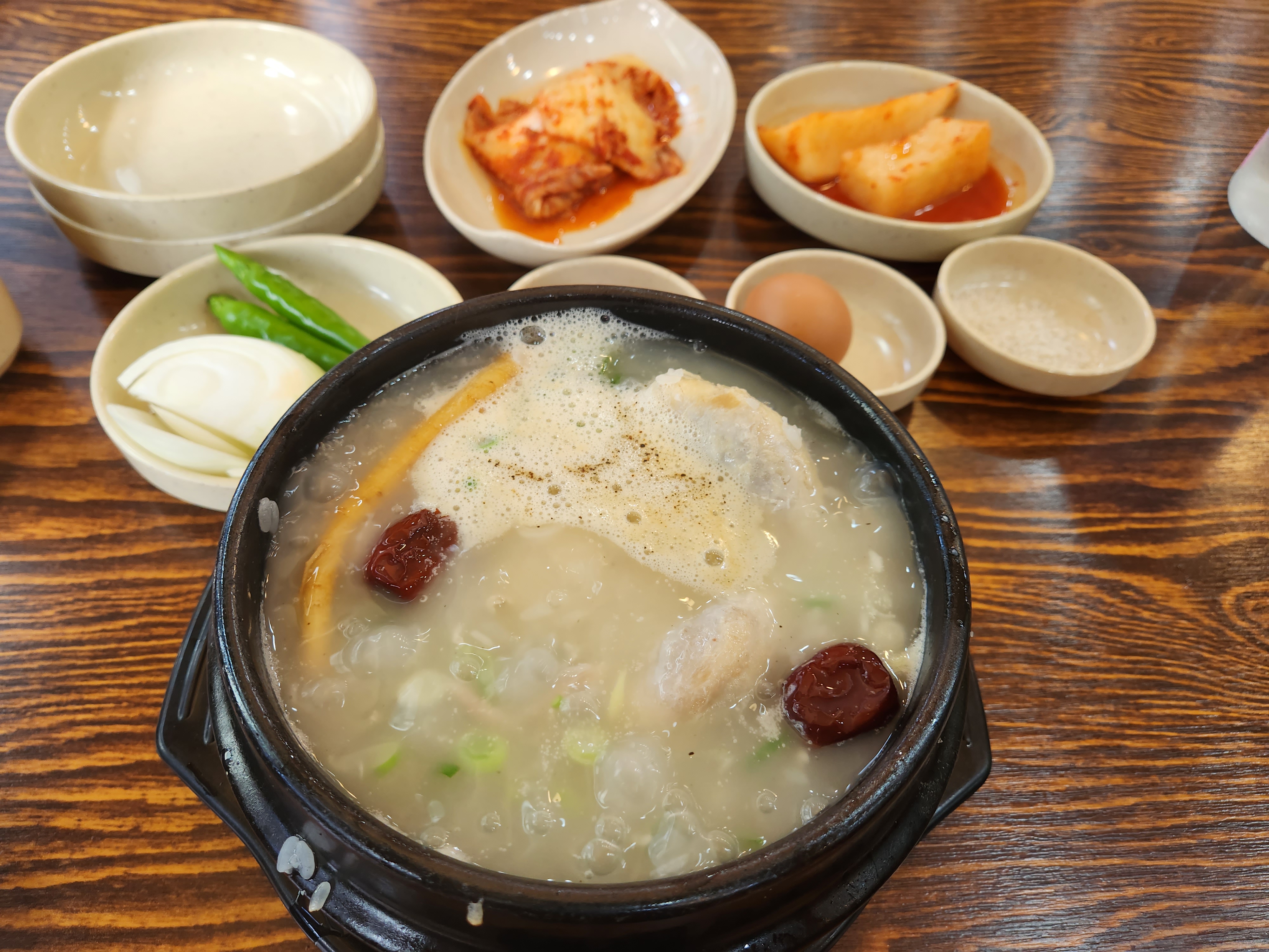 어느 삼계탕맛집 답게 김치 깍두기, 계란 양파고추가 반찬으로 나와요.