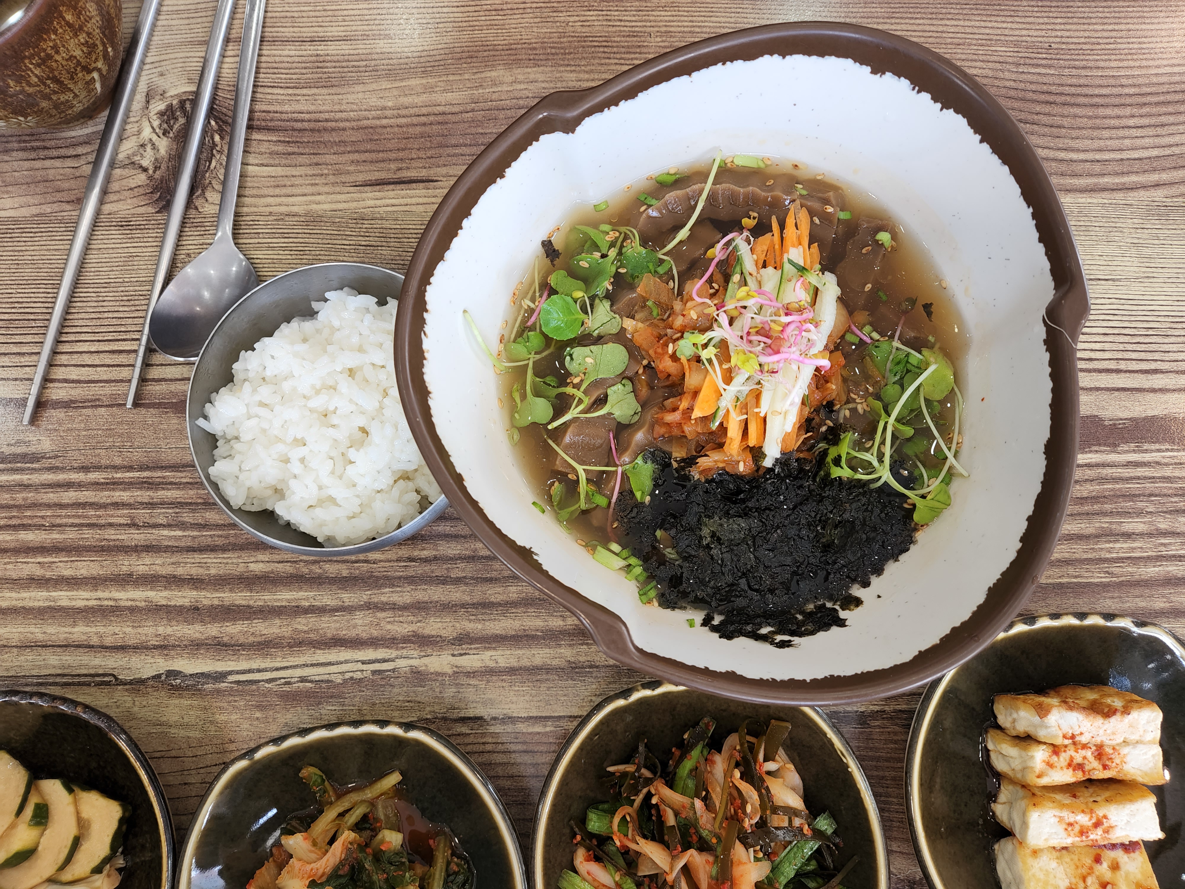 밥은 따로 나오고, 묵과 야채 그리고 시원한 국물이 들어가 함께 나눠먹기 좋았어요.