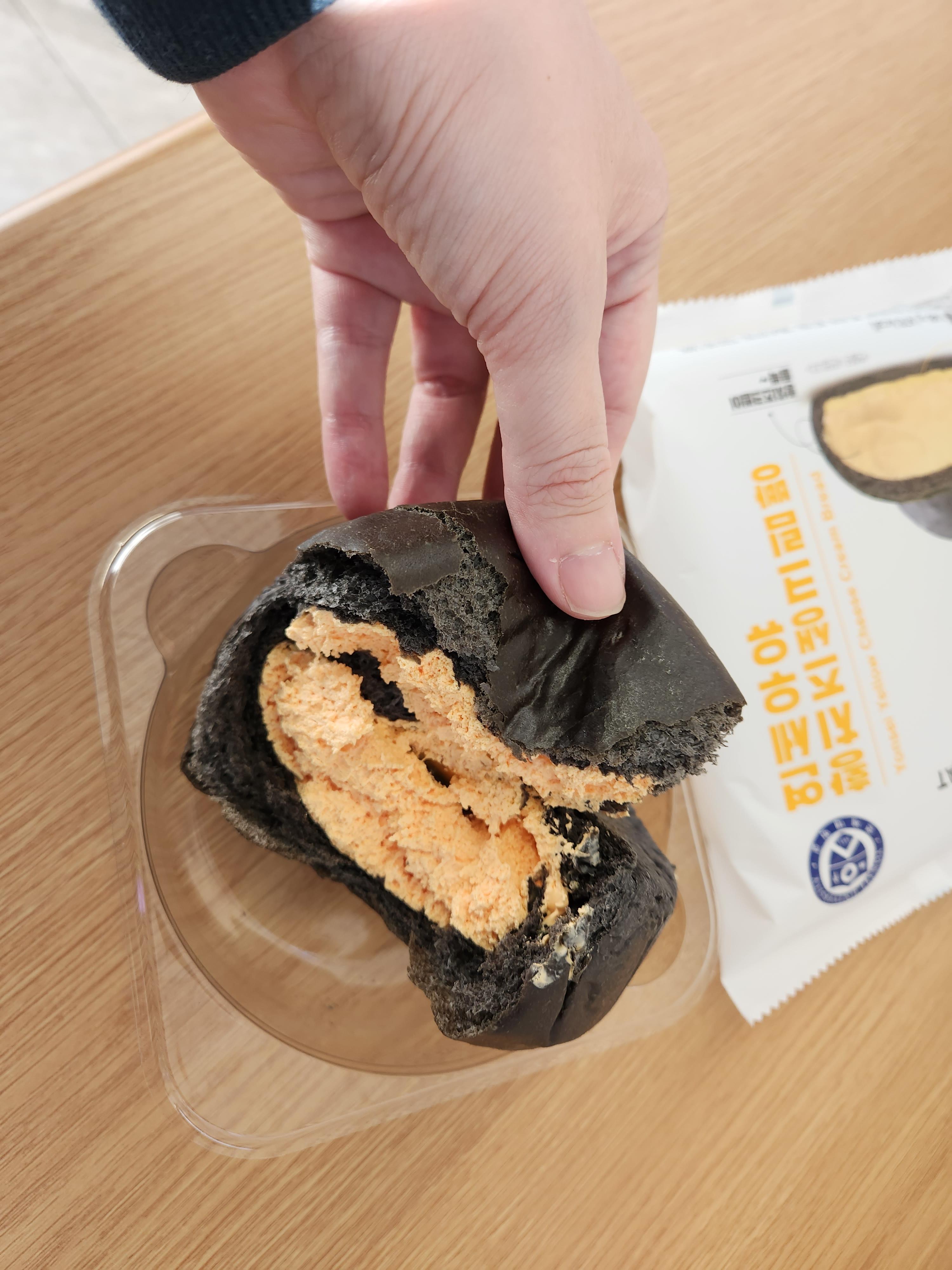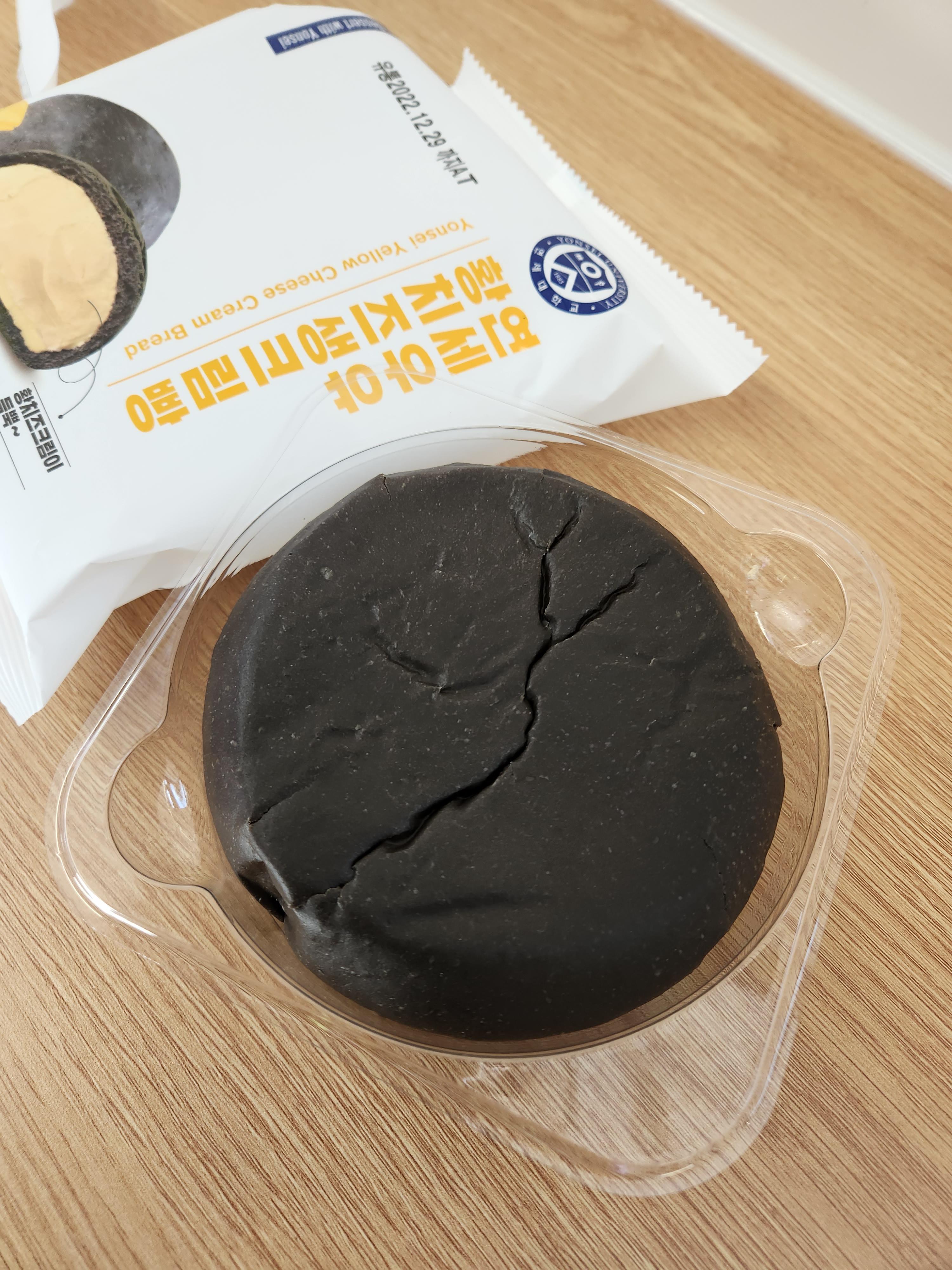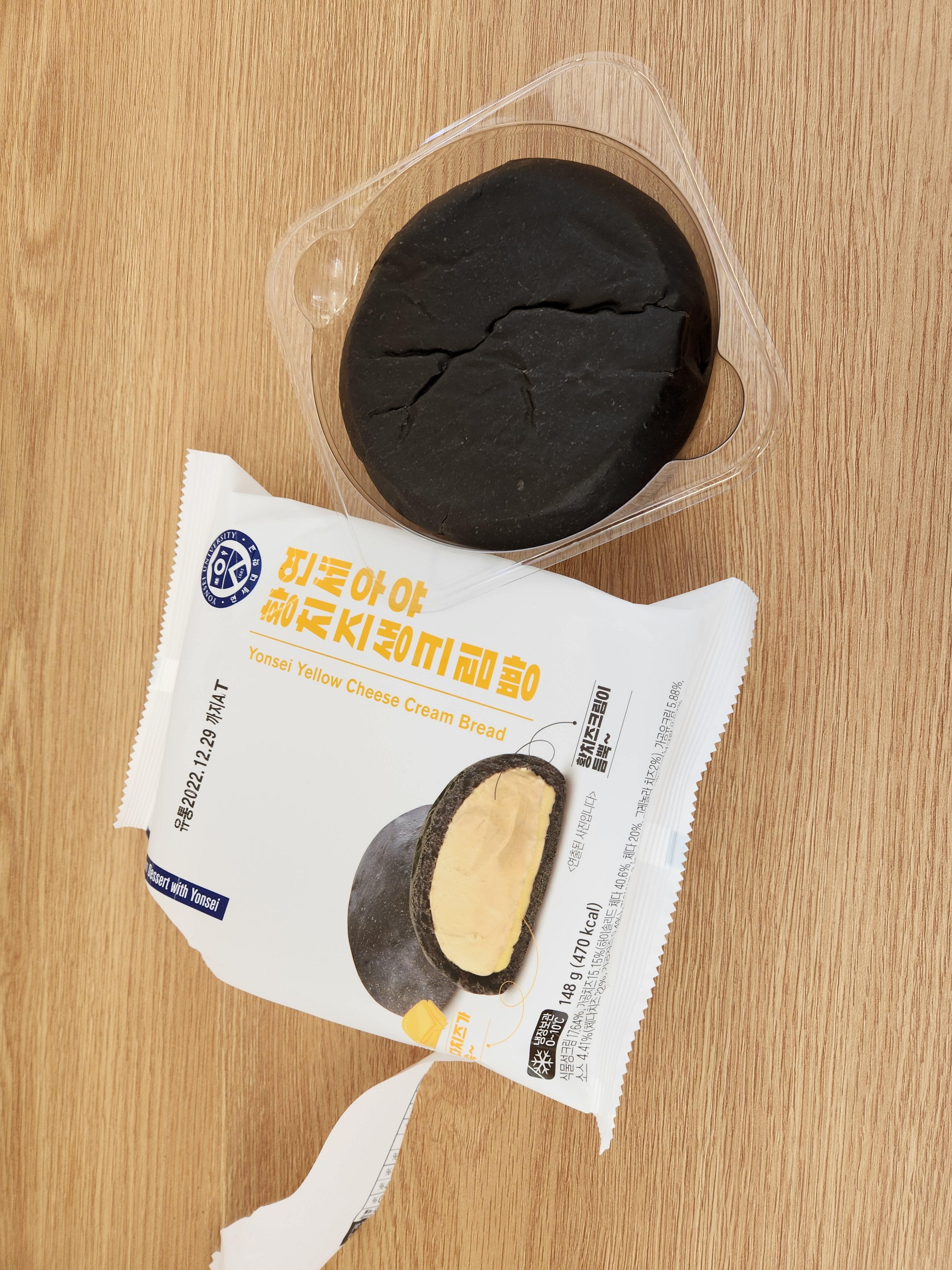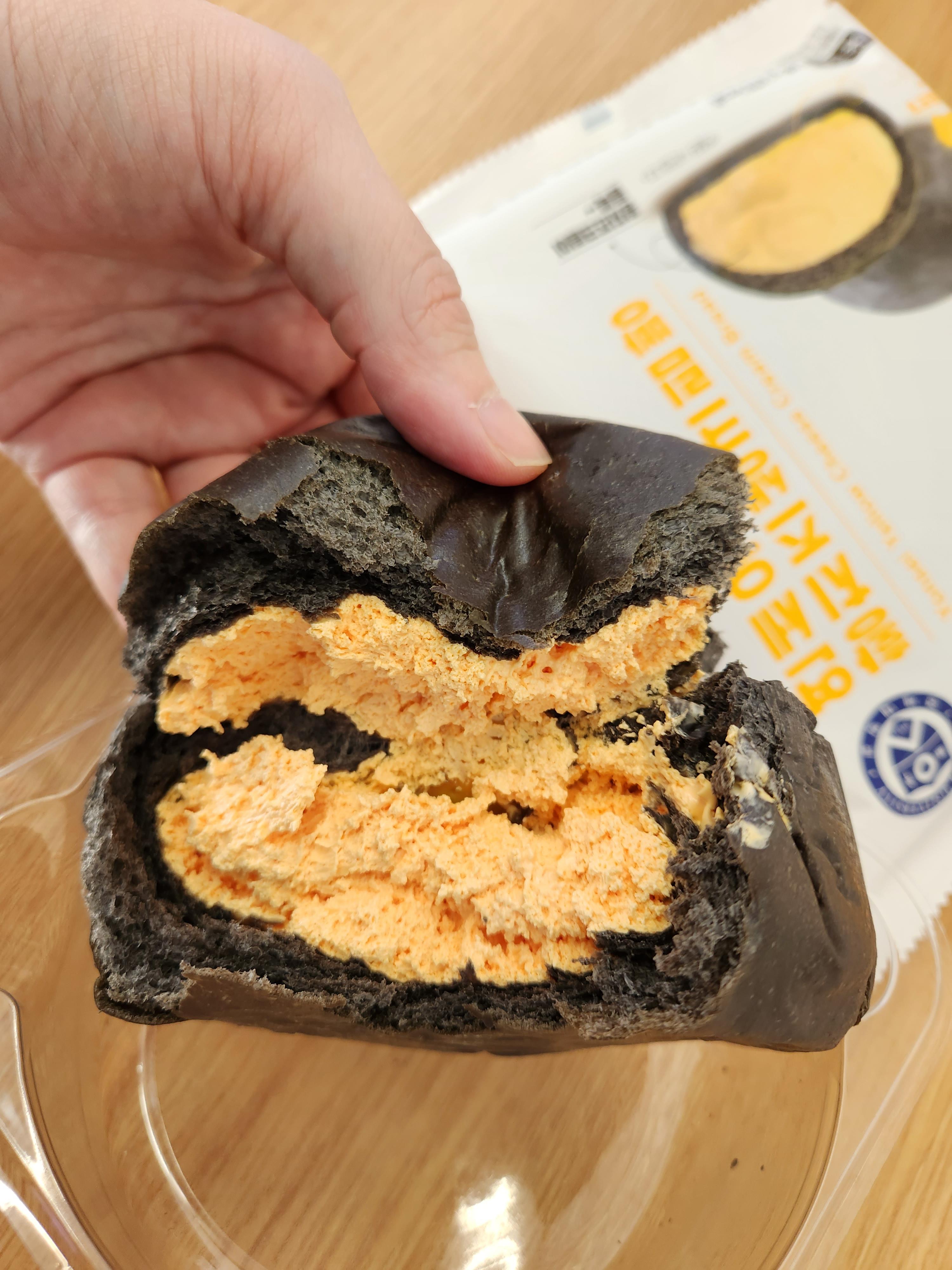 포장 이미지와 같은 블랙 색상의 겉표면의 황치즈생크림 빵이에요.