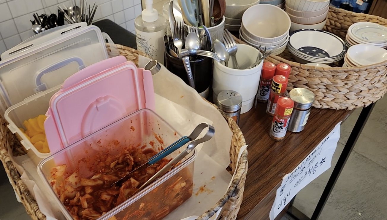 가게 중간에는 식기류와 기본 반찬을 셀프로 떠올 수 있는 곳이있어요.