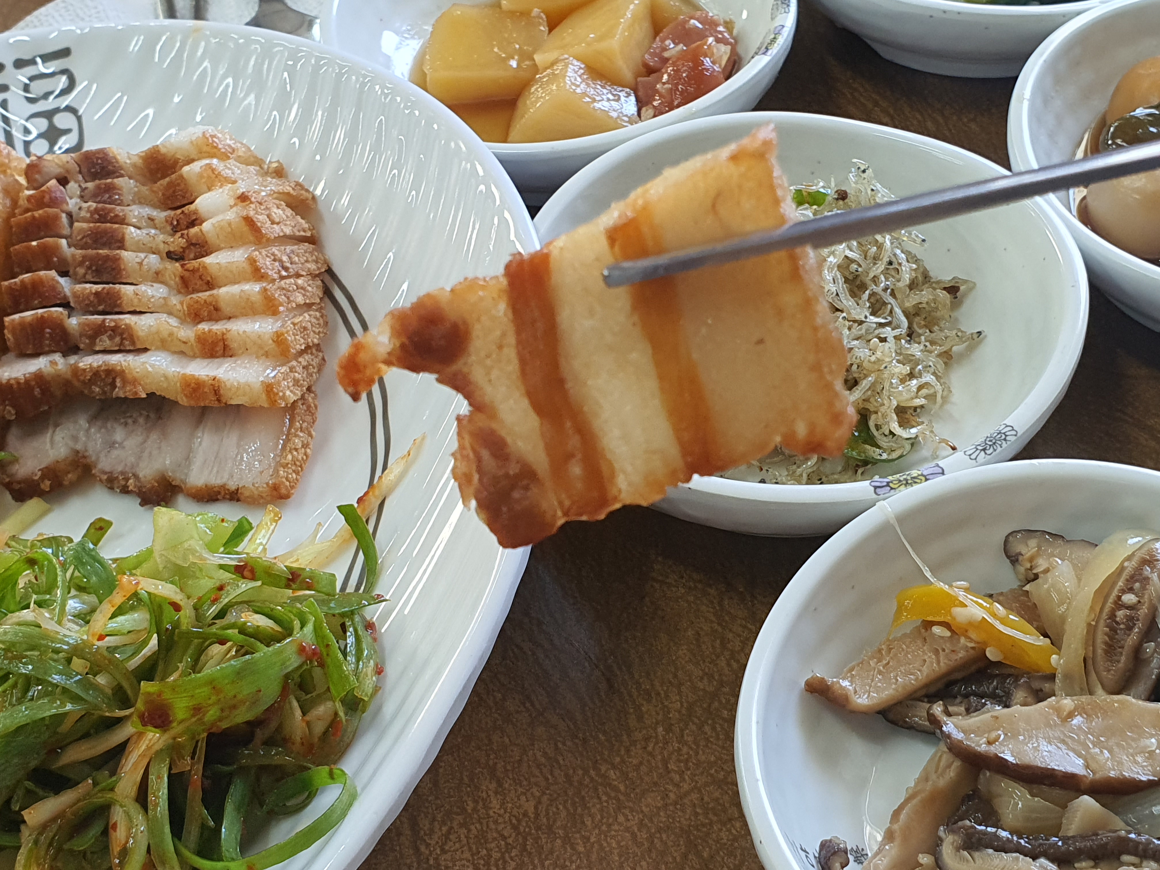 돔베고기는 수육같은 느낌인데, 제주도 맛집 화순한가네식당에서는 고기 겉면을 살짝 튀겨 나와요.