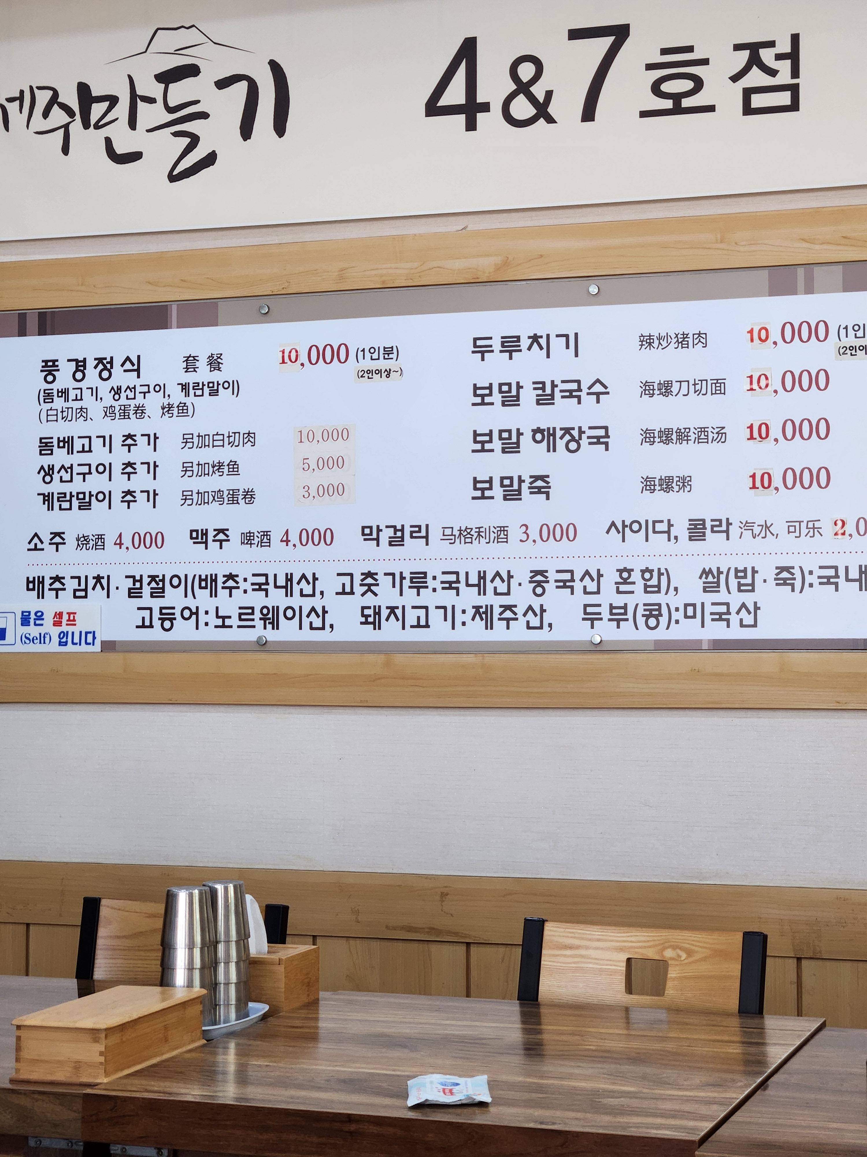 두루치기, 칼국수, 보말죽 등등 다른 메뉴도 모두 1만원에 즐길 수 있습니다.