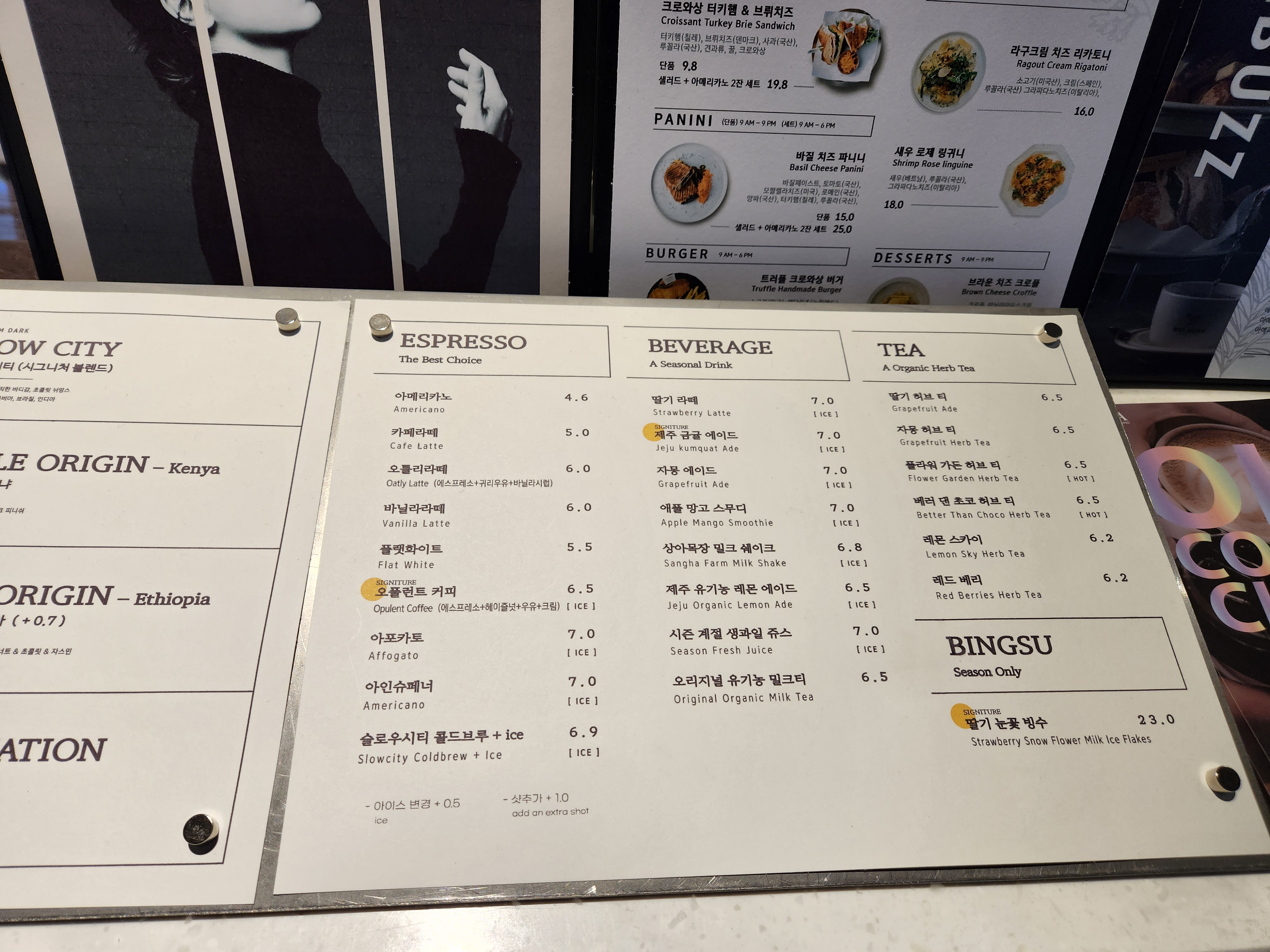 커피 전문점답게 드립커피도 보이고, 슬로우시티, 싱글오리진케냐, 싱글오리진에티오피아, 디카페인까지 다양하게 준비되어있어요.