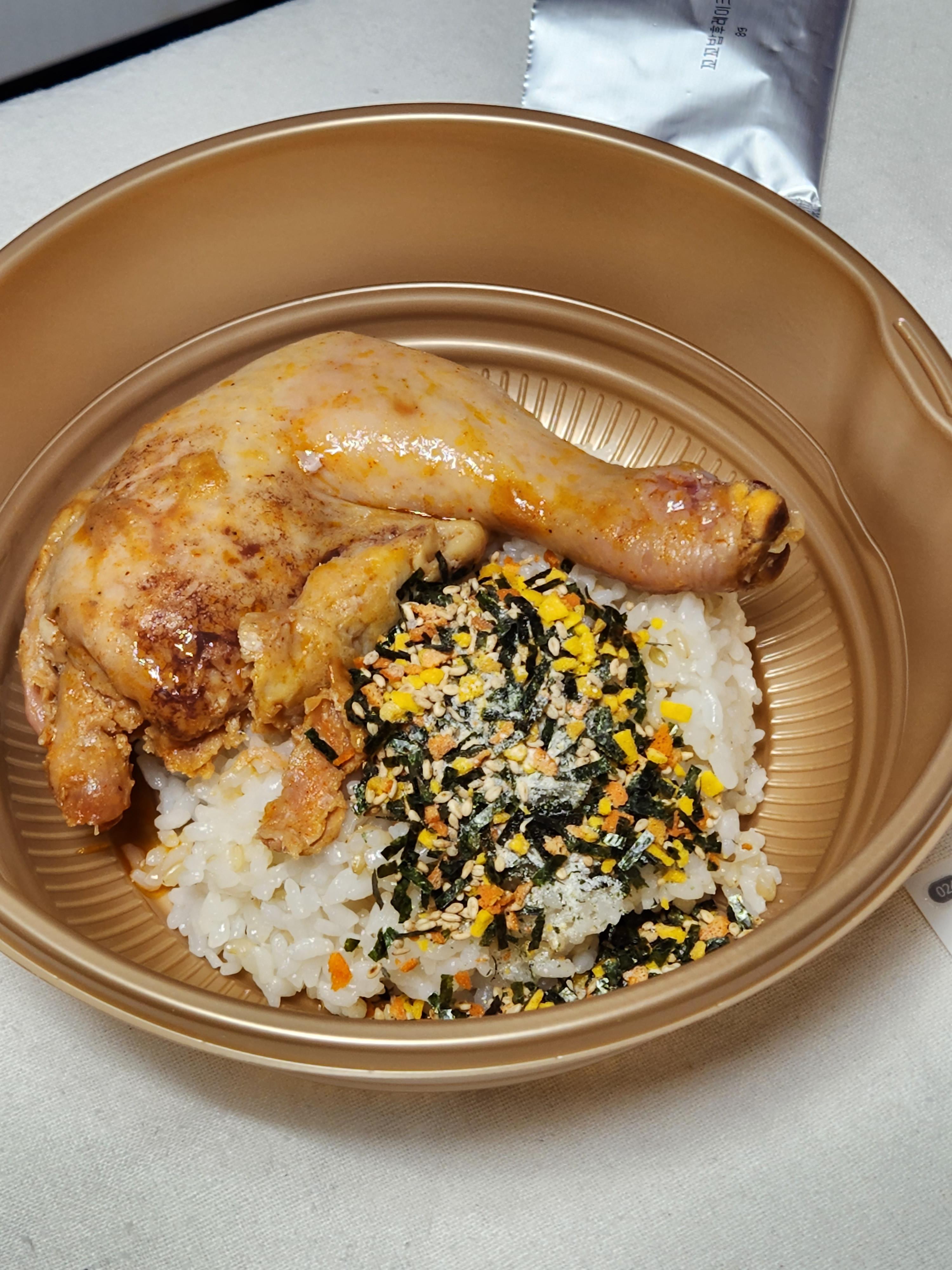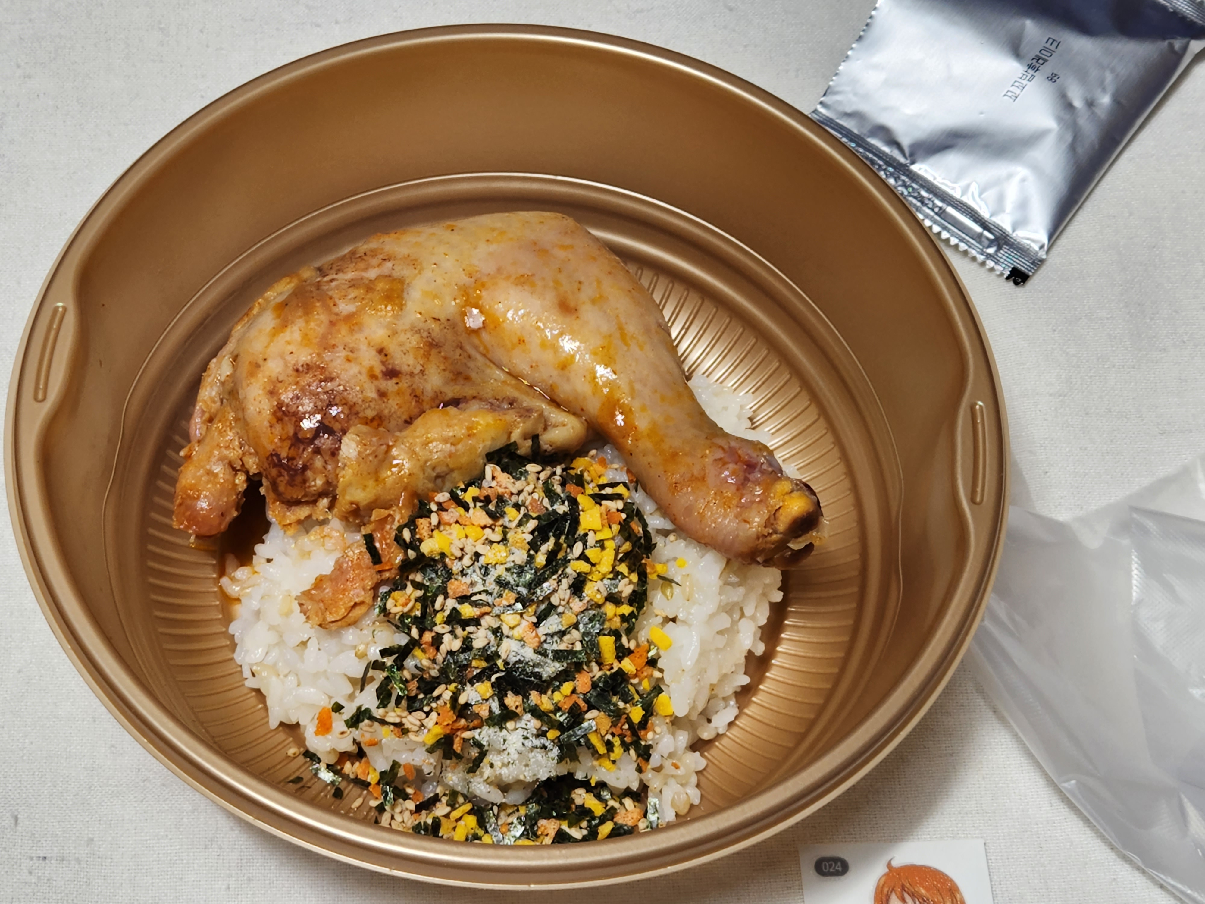 - 후레이크가 뿌려진 밥 옆에 닭다리를 담아 맛있게 드세요.