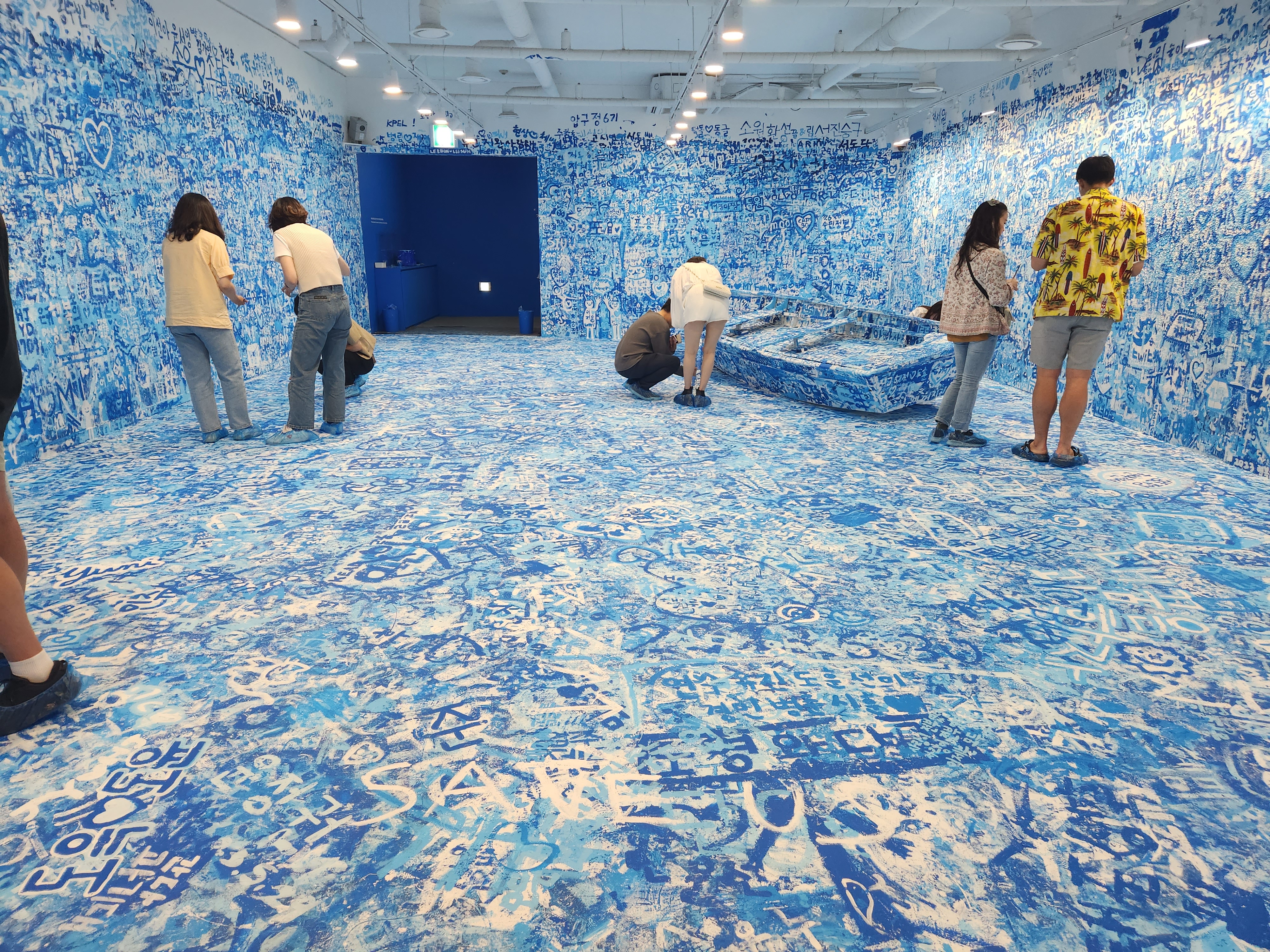 페인트가 묻을 수 있기 때문에 발 커버를 받고 들어가 자신이 원하는 메시지를 남기면 되는 공간이에요.