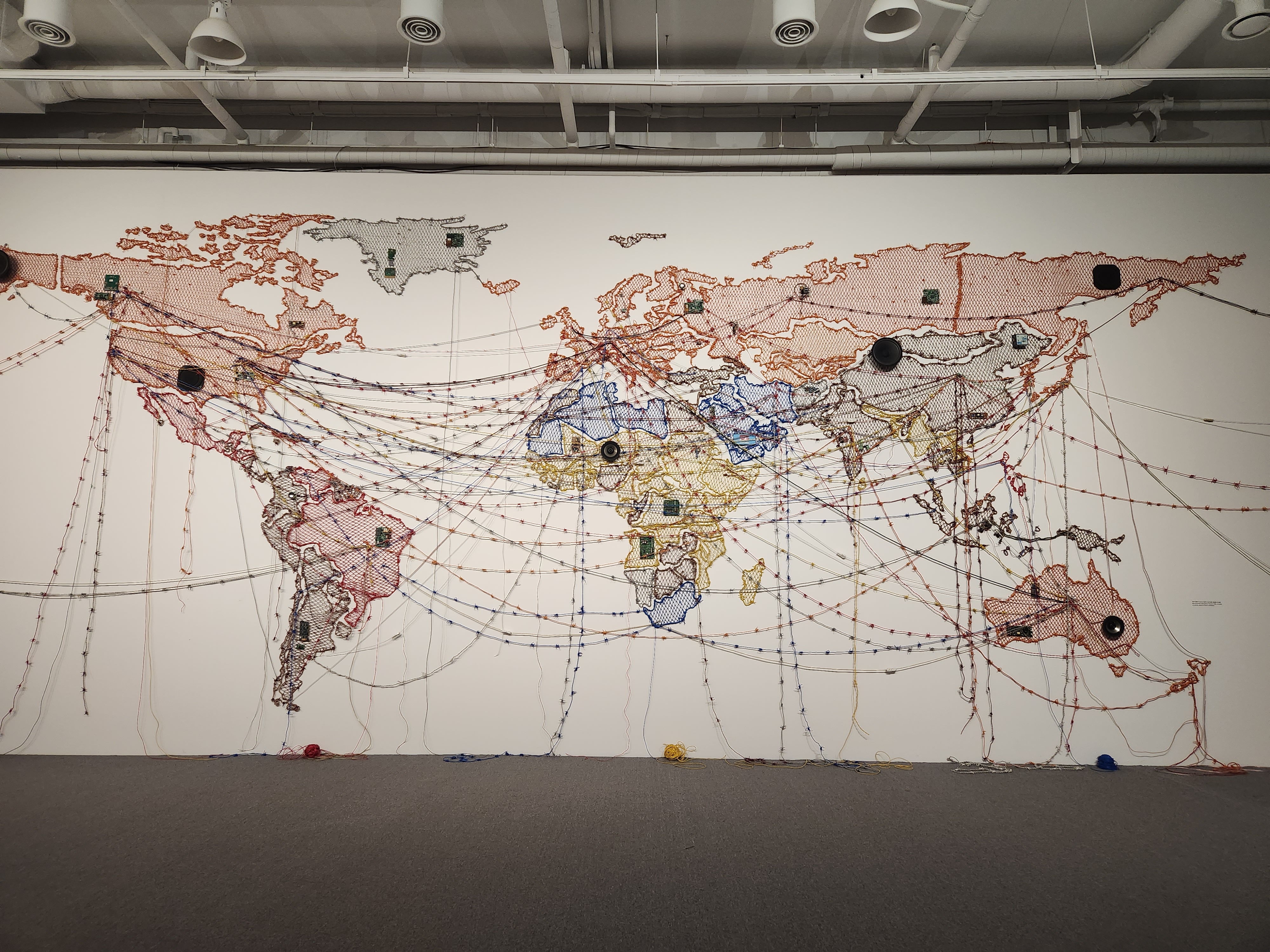 작품명은 리나 칼라트로 이주 노동의 경로와 흐름을 추적하여 색색의 전선으로 직조한 세계지도 작품이에요.
