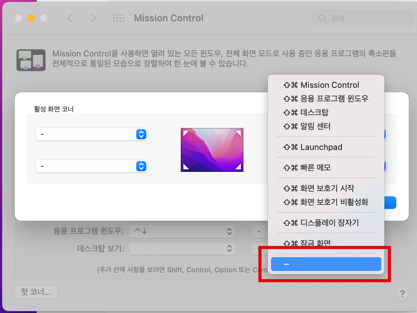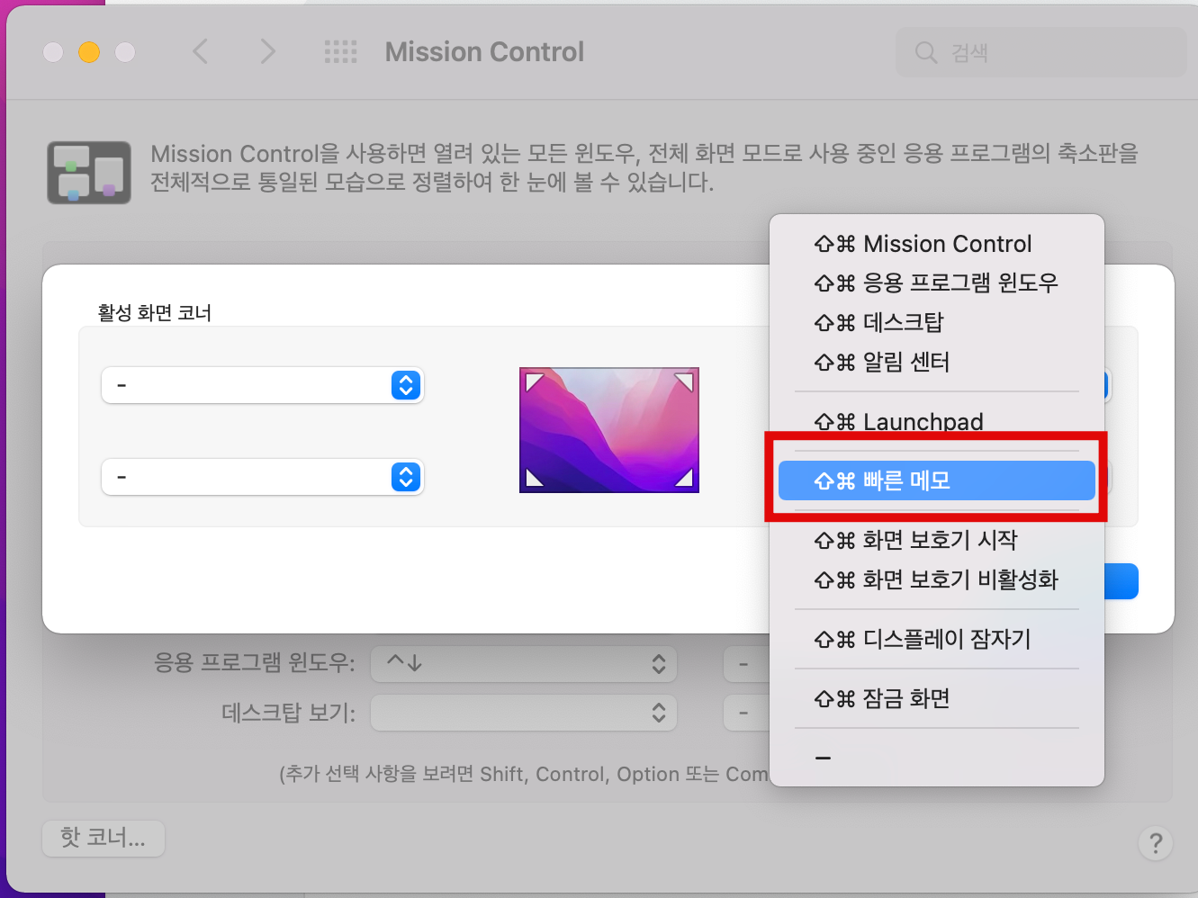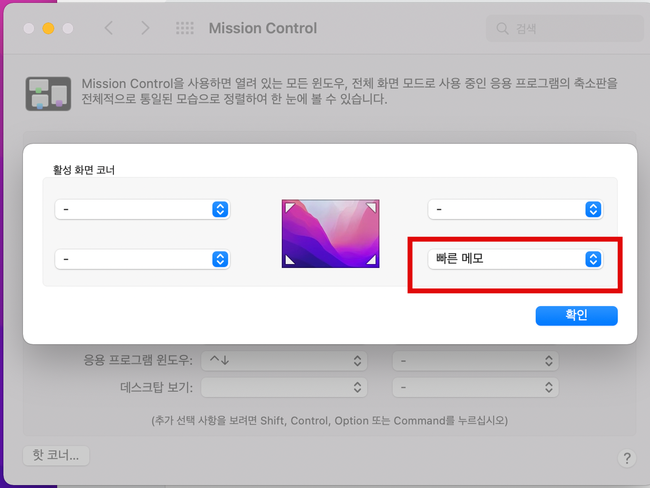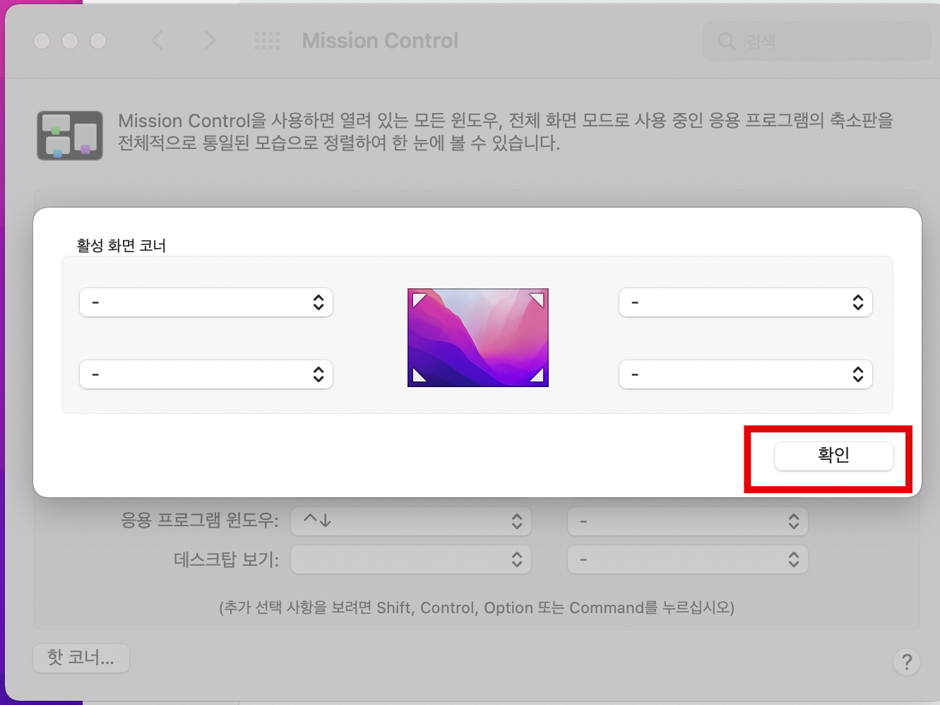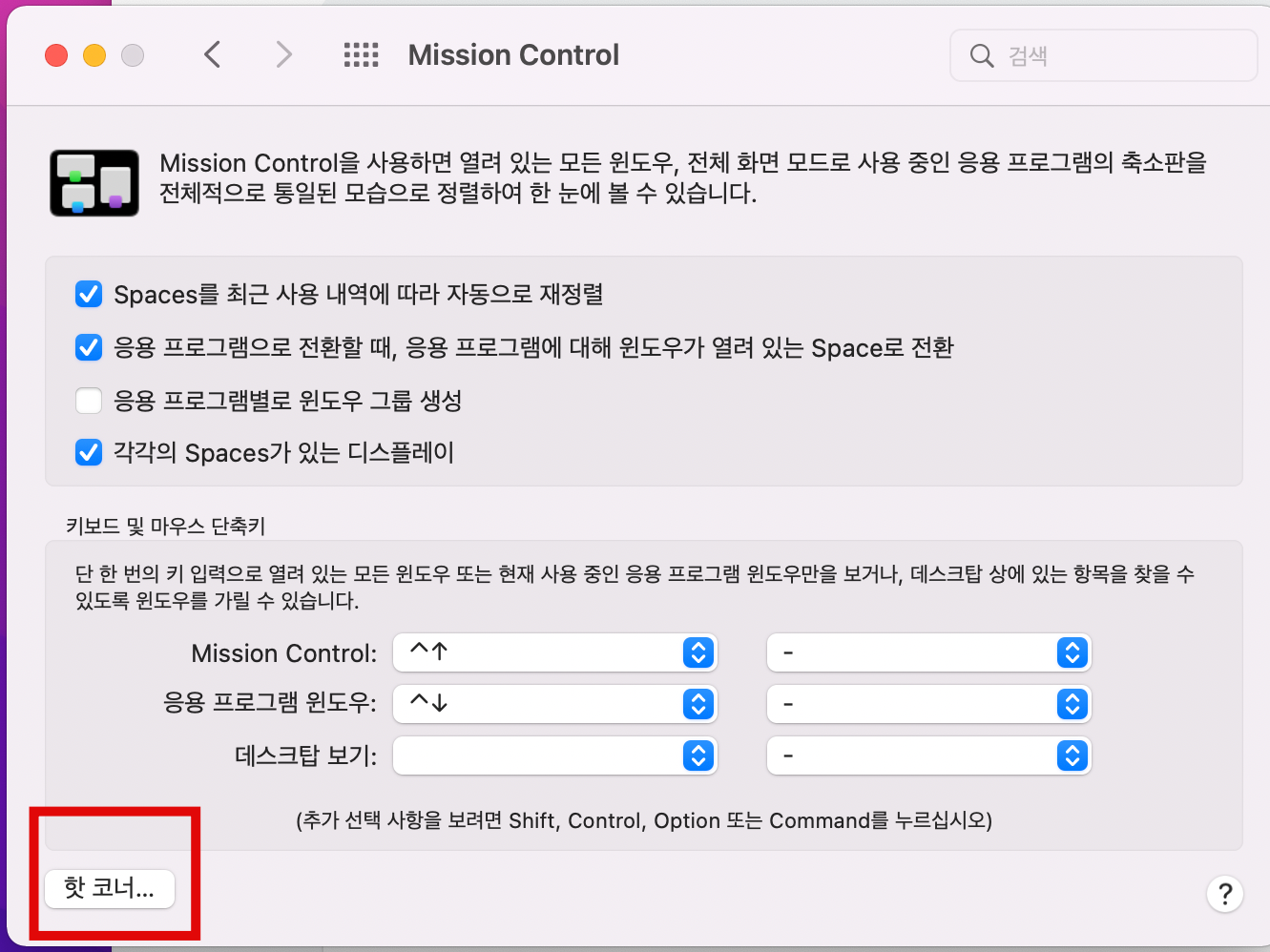 왼쪽 맨위 사과 클릭 -> 시스템 환경설정 -> 미션컨트롤 클릭