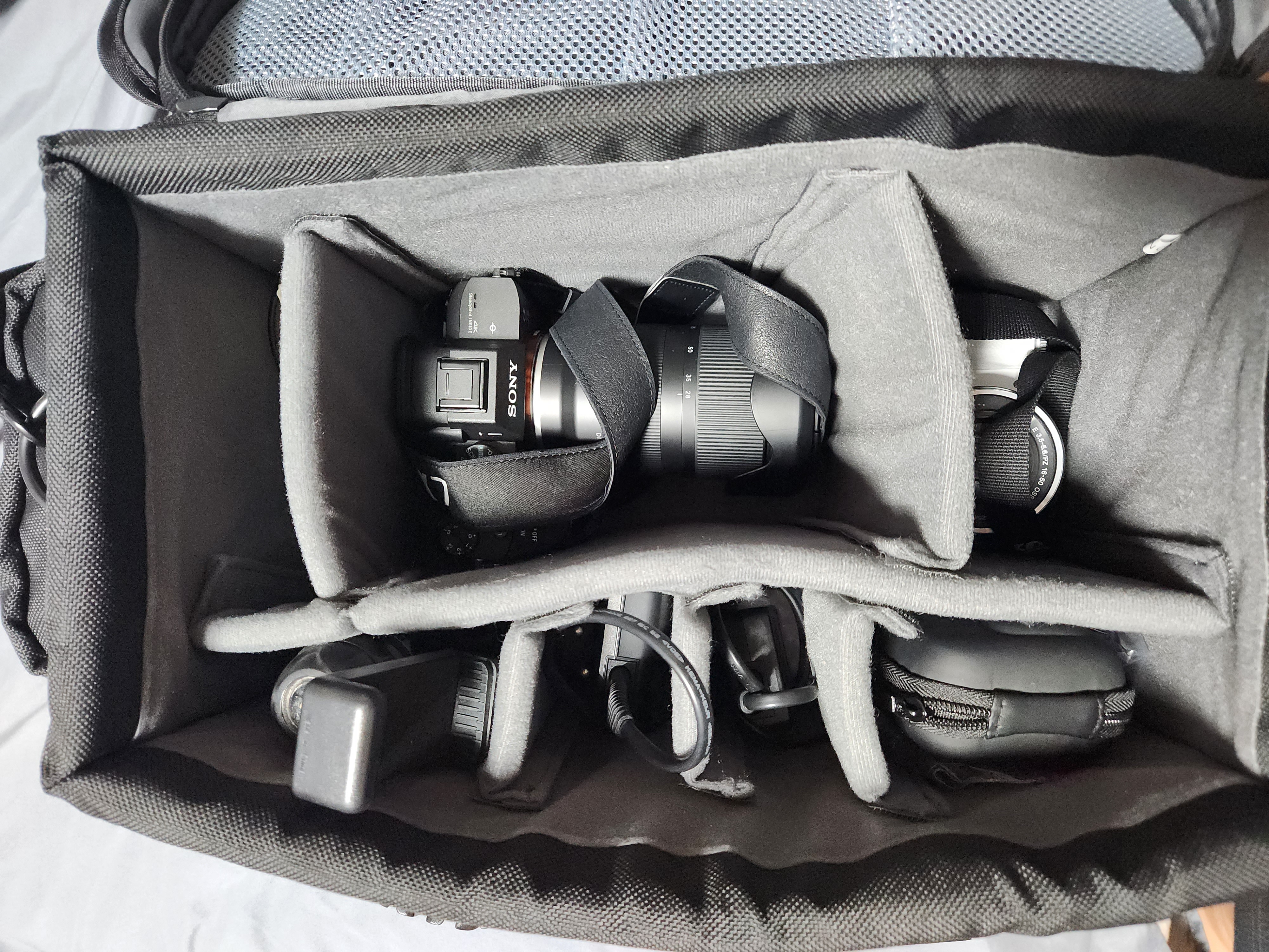 너무 무거우니깐 자주 사용하는 카메라 2대만 넣어보았다