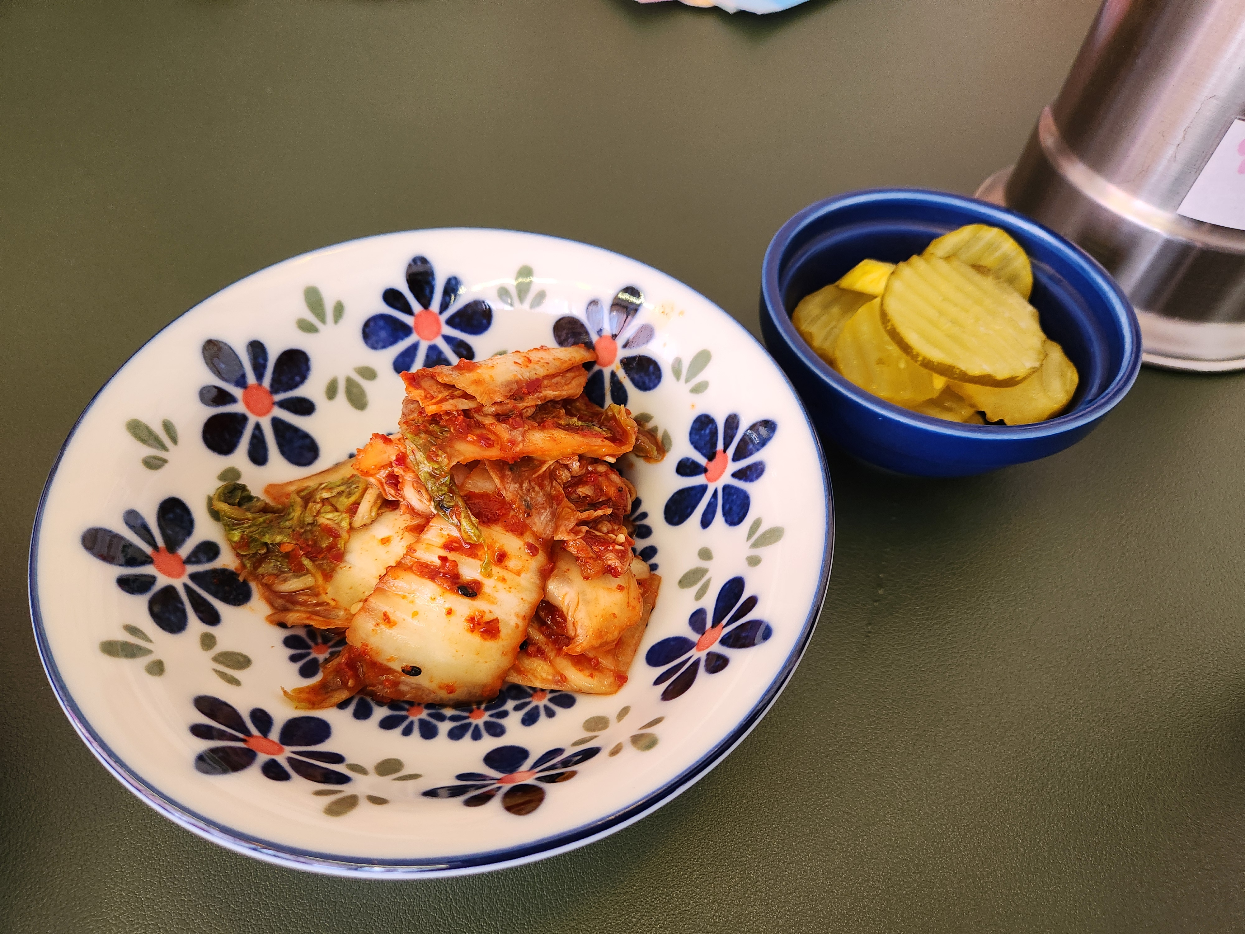 돈까스와 함께 먹을 김치와 피클이 기본으로 나온다.