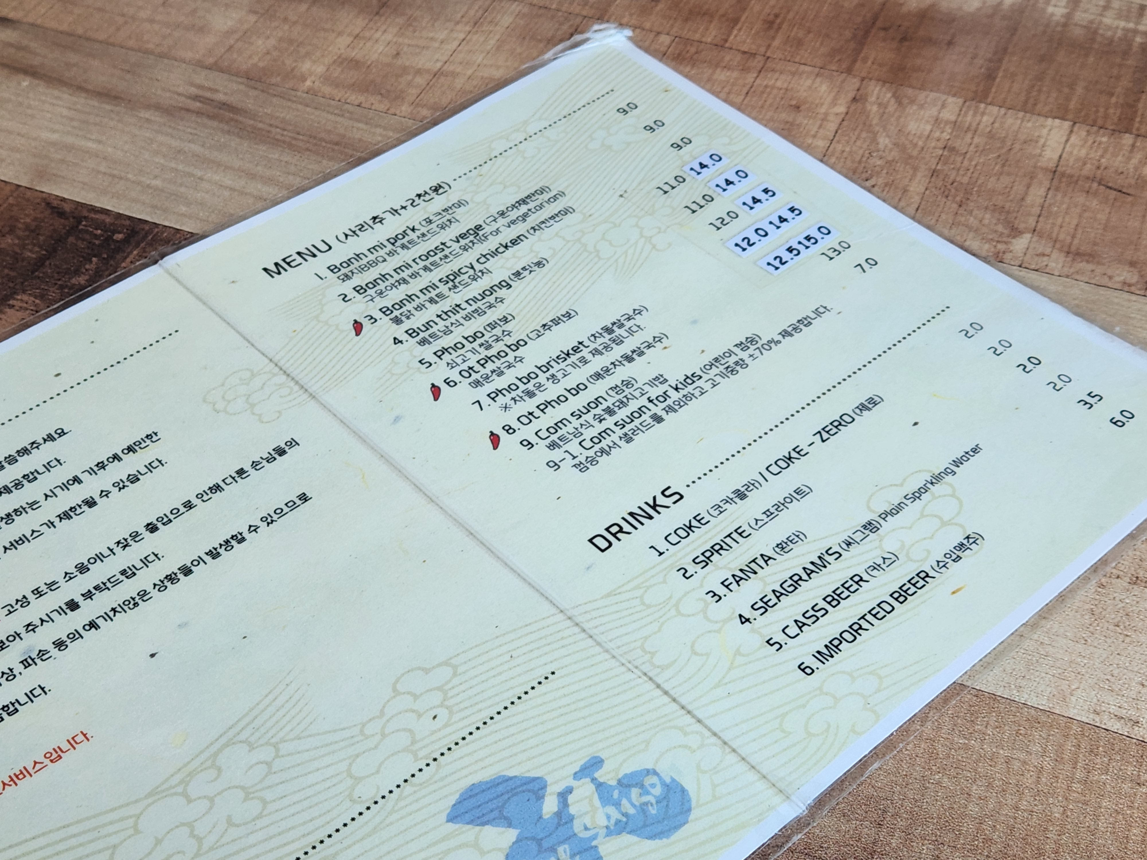 메뉴는 쌀국수, 껌승, 반미가 주력메뉴이다.