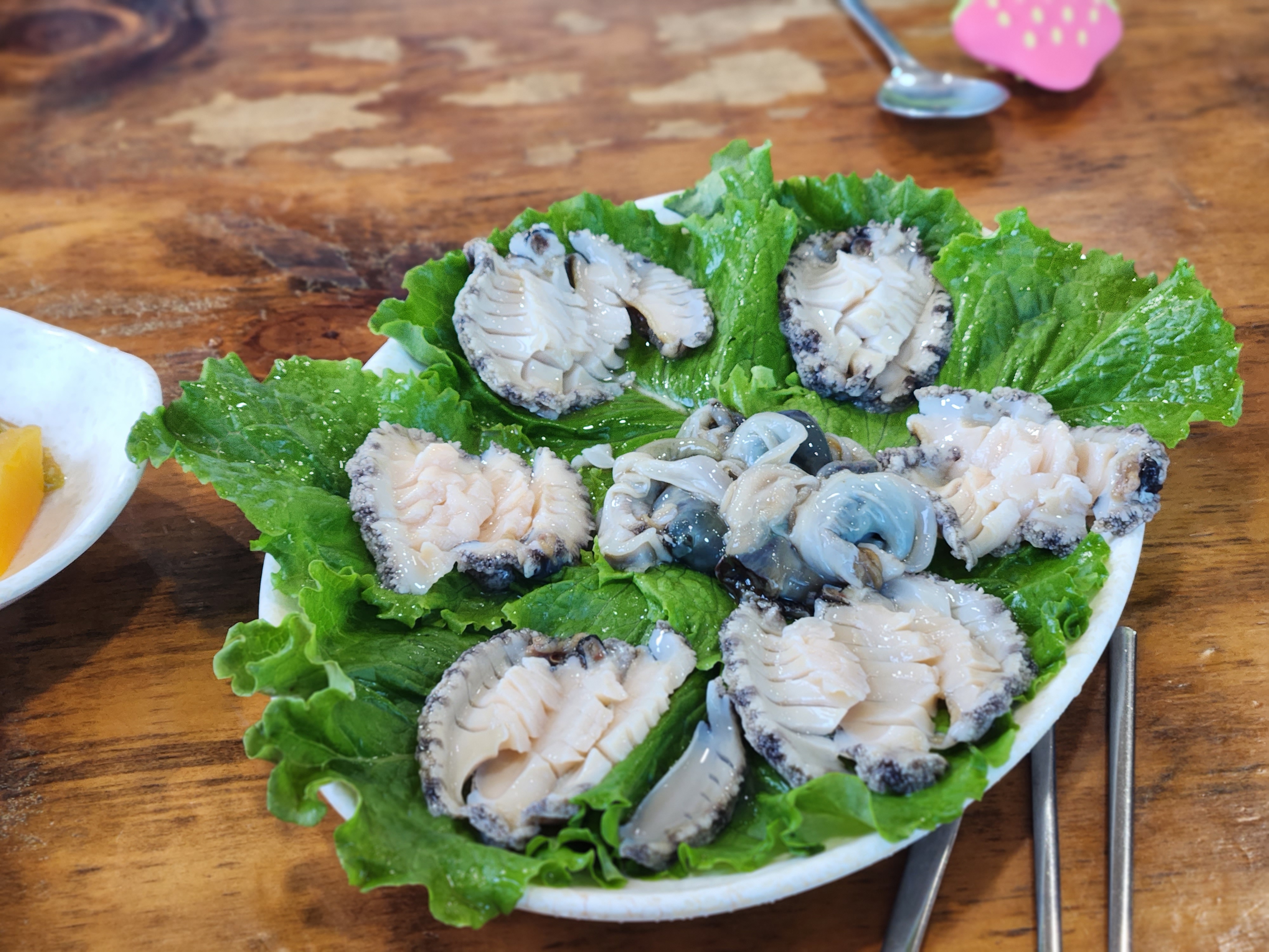갓 잡은 전복회는 꼬들꼬들 참기름장과 먹으면 별미~!
