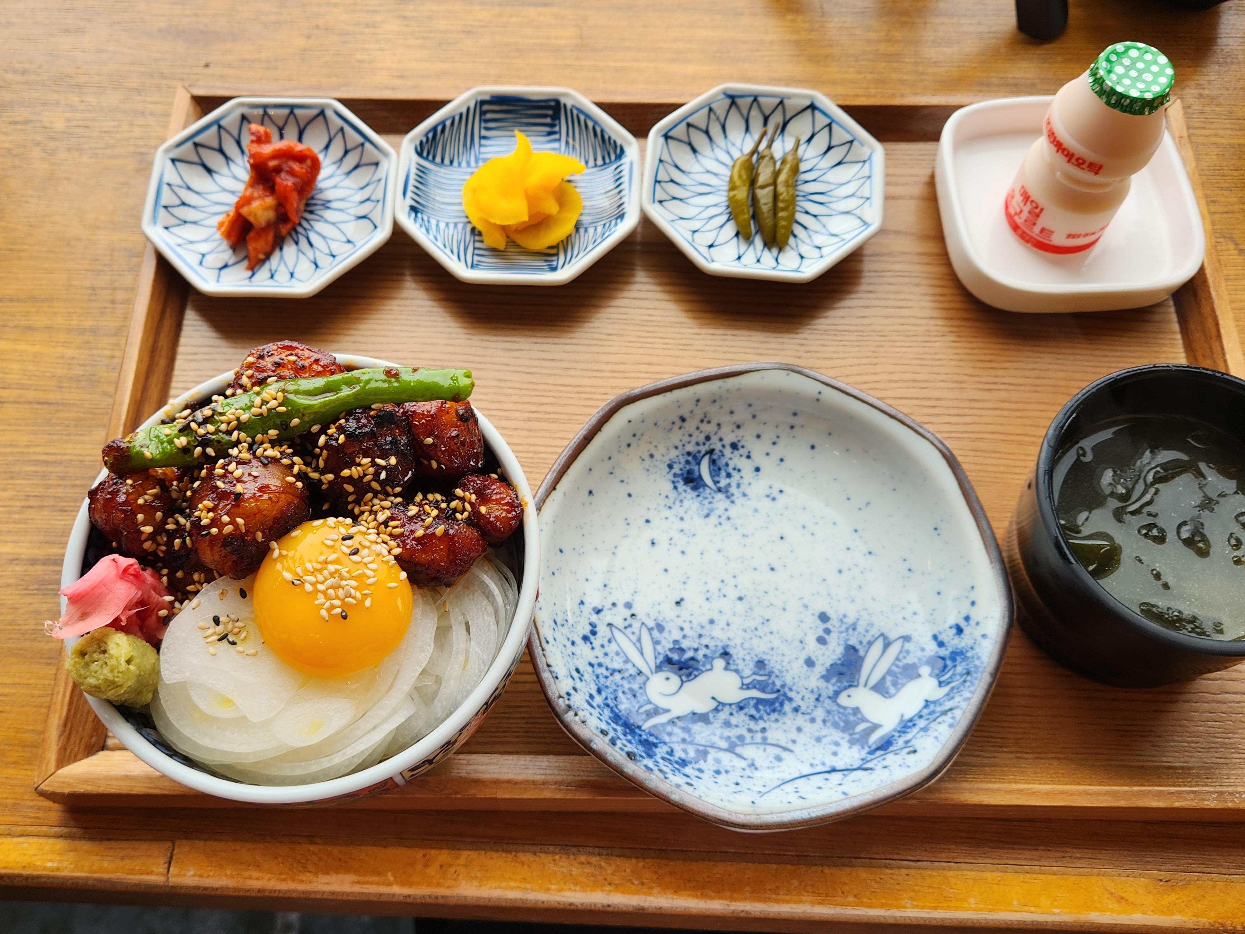 대창덮밥에는 꽈리고추, 양파, 생강, 겨자