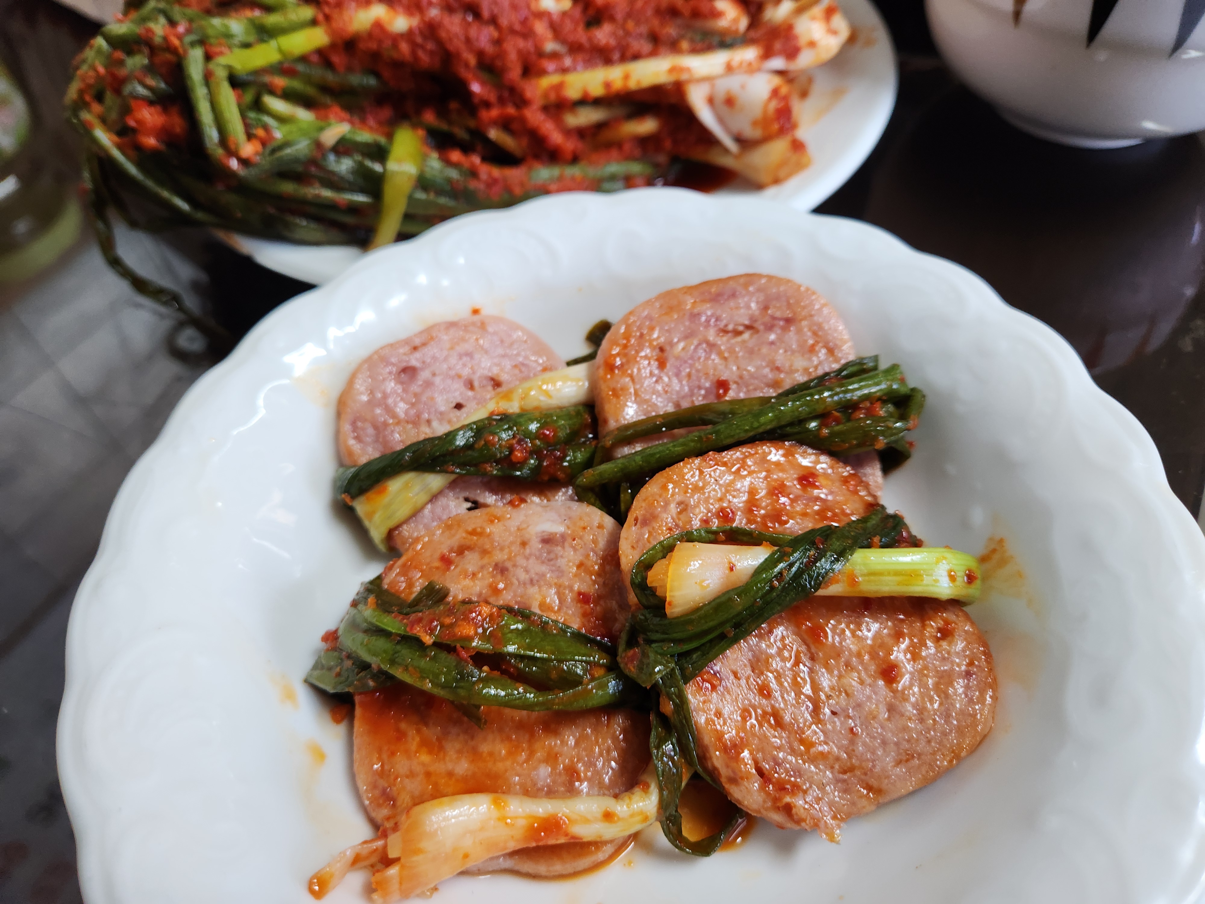 마침 햄이 많아서, 햄이랑 파김치를 같이 싸 먹어보았다.