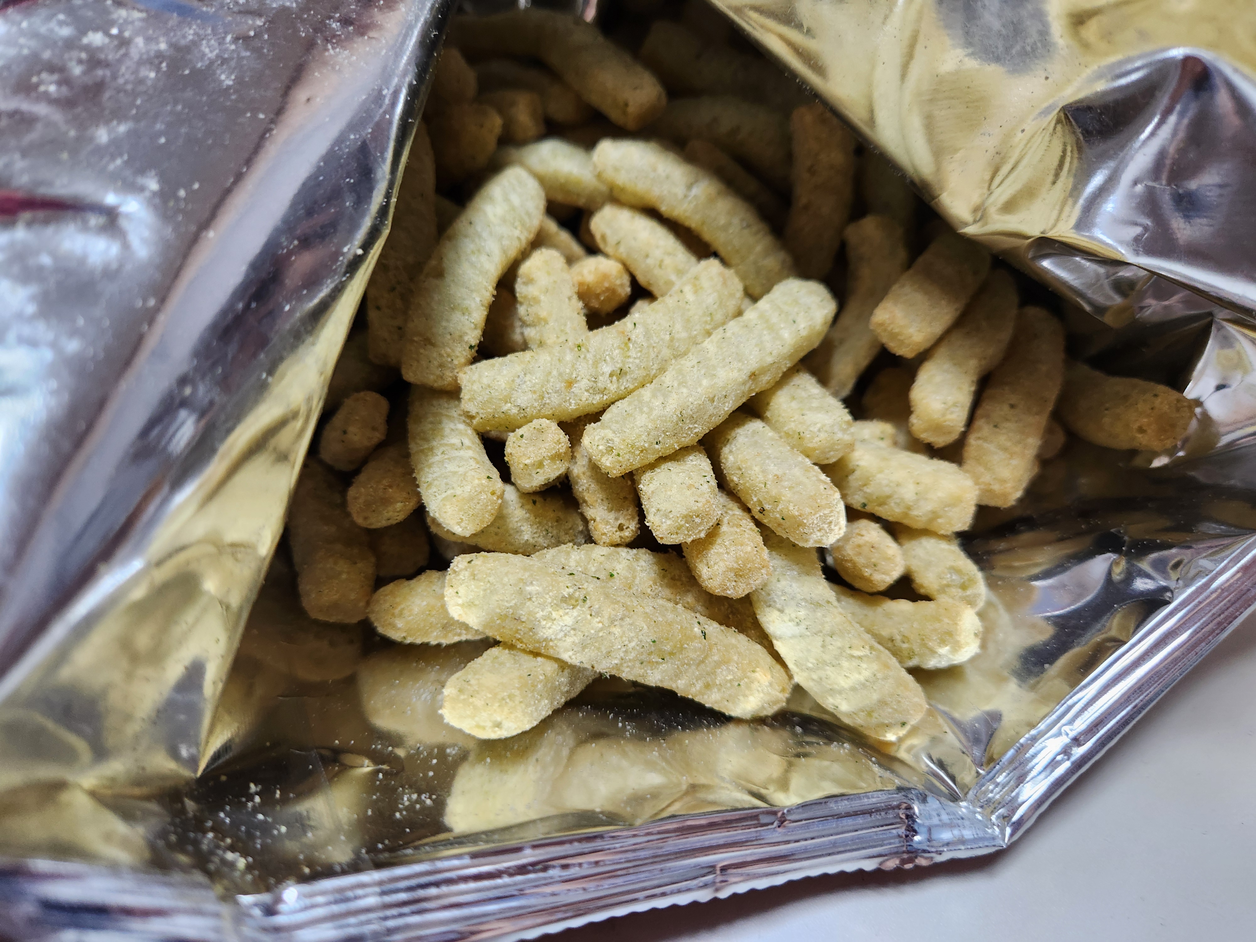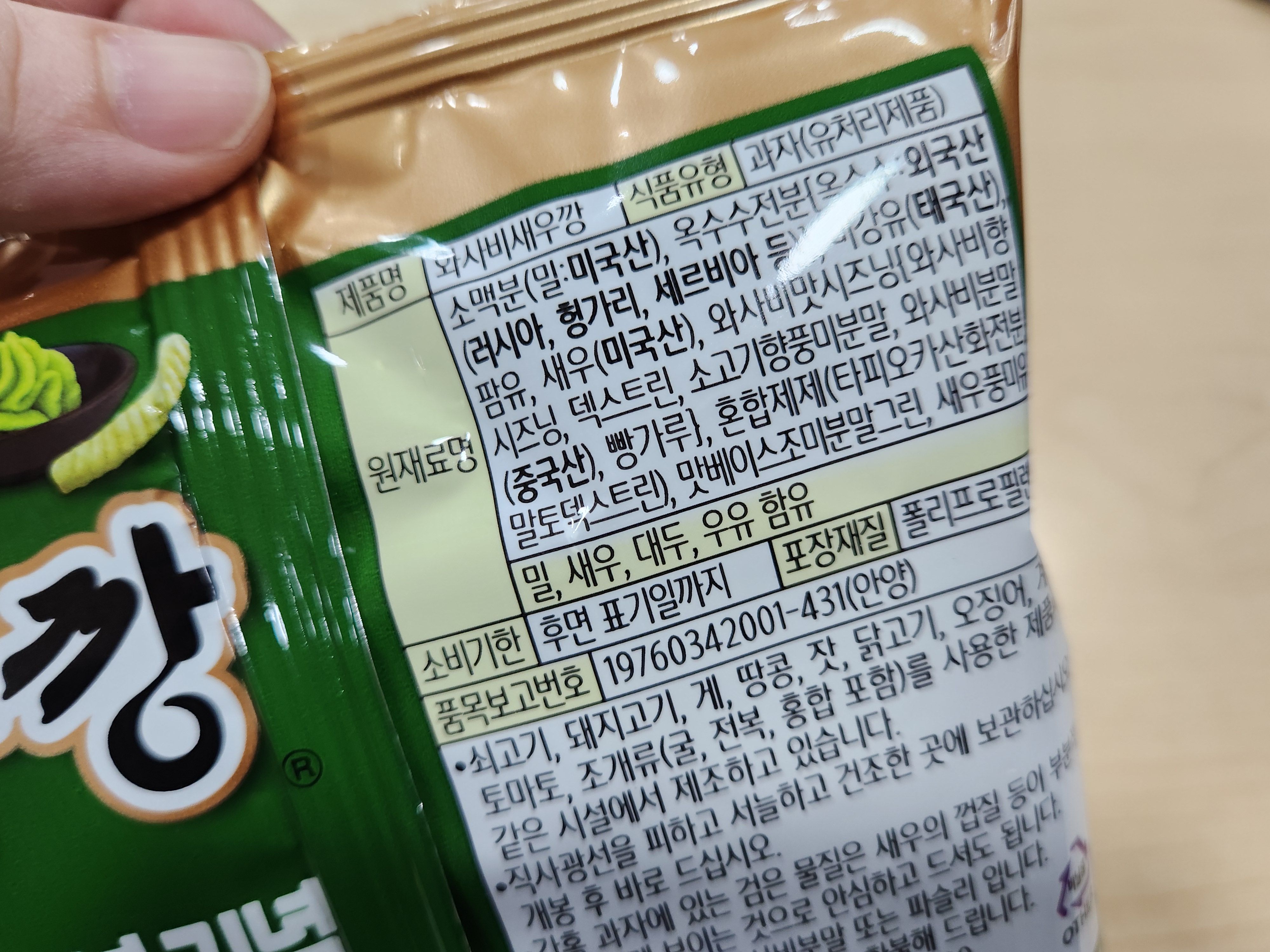 과자 봉투를 뜯자 은은하게 퍼지는 와사비 향이 확실하게 난다.