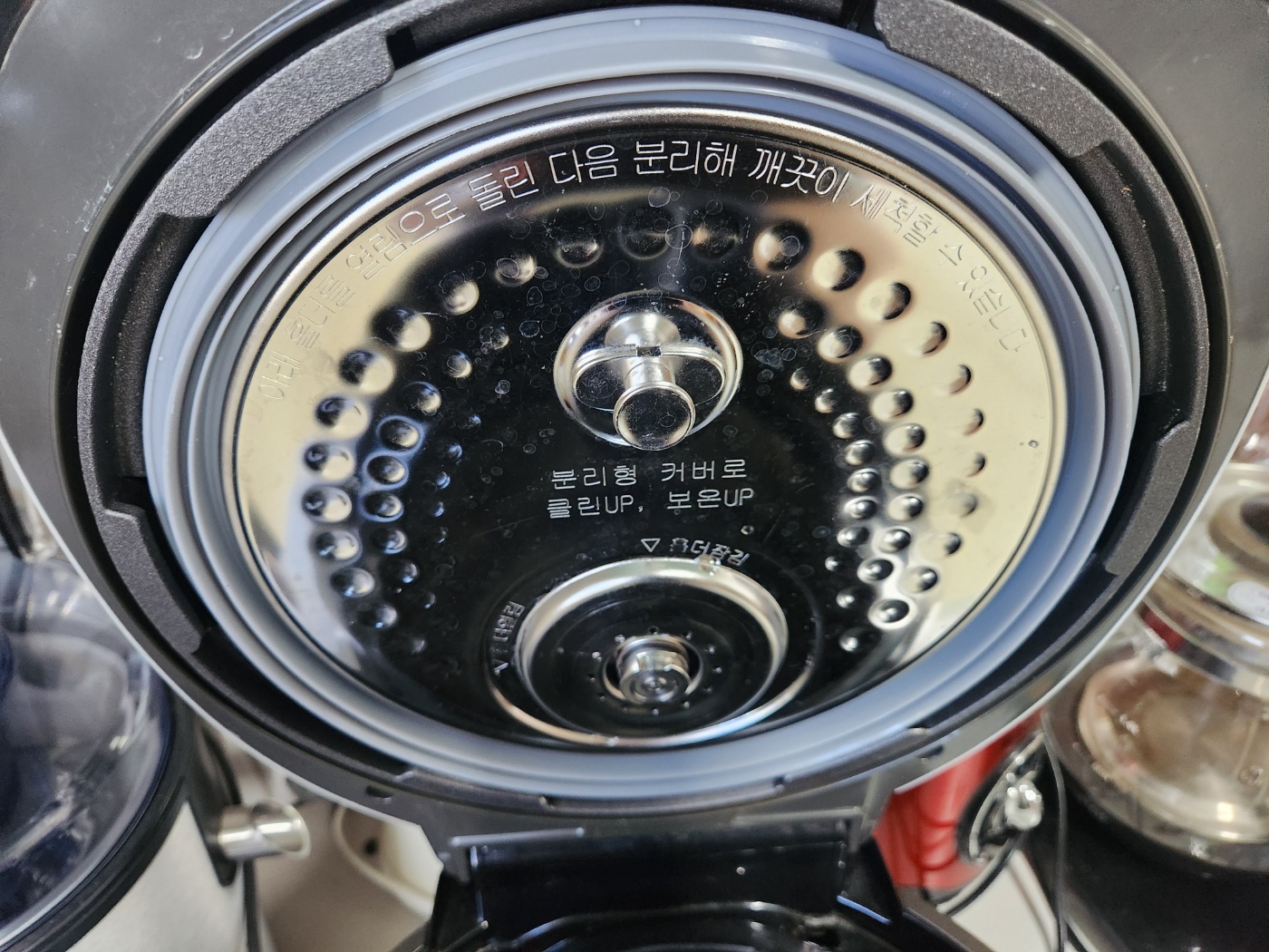 분리형 커버와 고무패킹: 커버를 분리하면 그 틈새에 말라붙은 밥물이 가득하다.