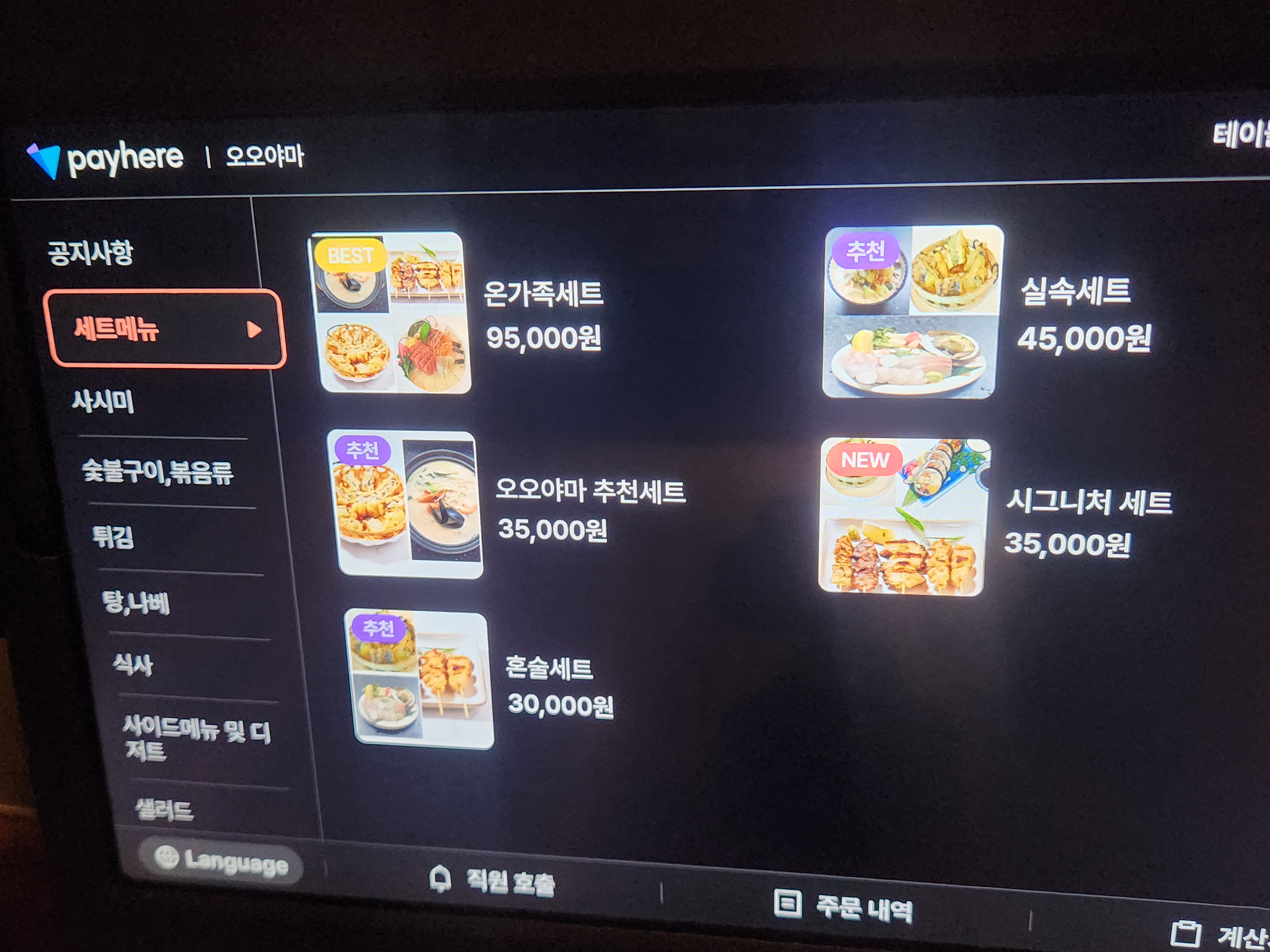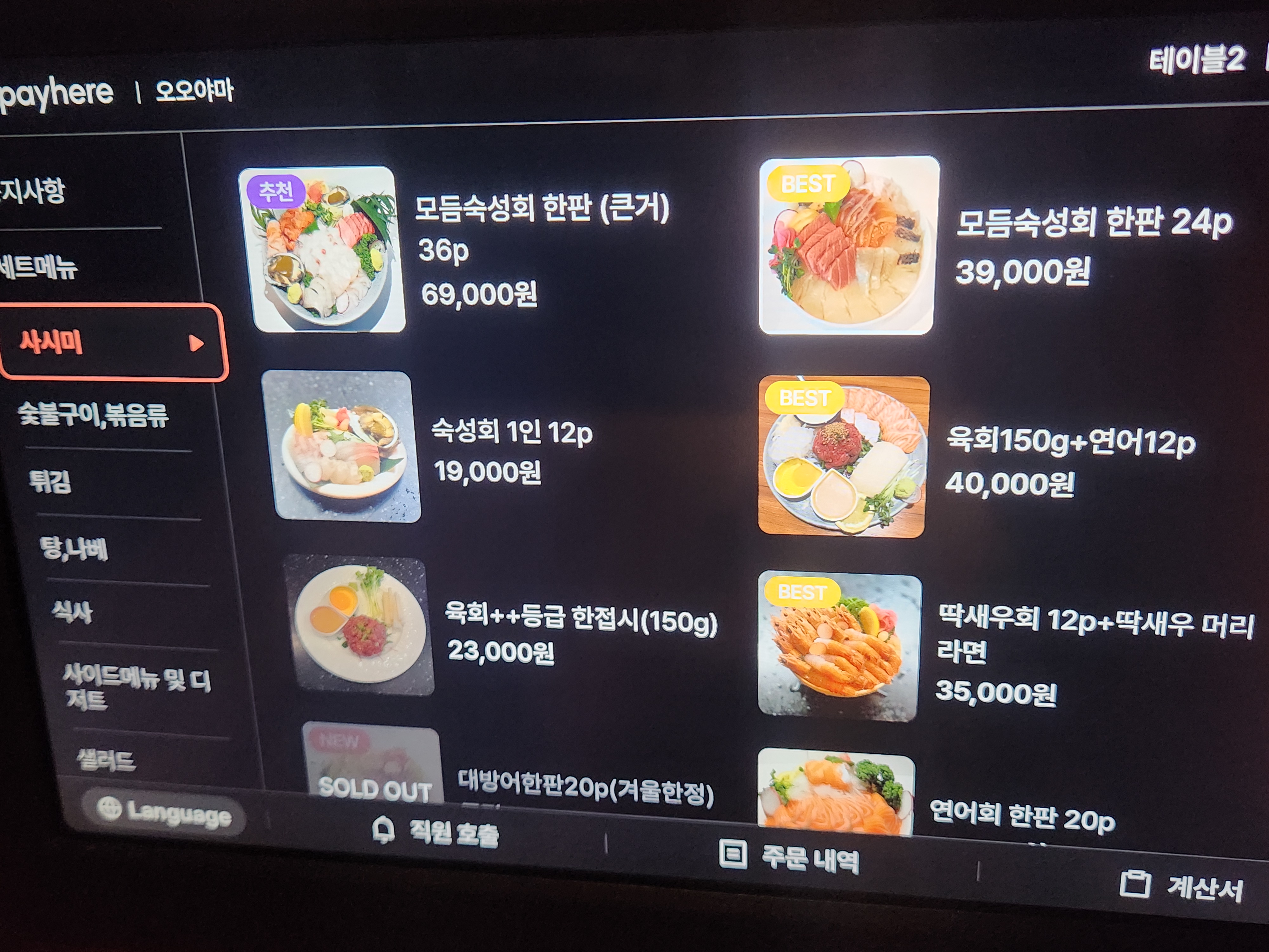 메뉴는 스시를 중심으로 회, 후토마키, 세트 메뉴까지 다양했는데 사진에 보이는 것처럼 메뉴판이 디지털로 되어 있어 고르기 편했어요.