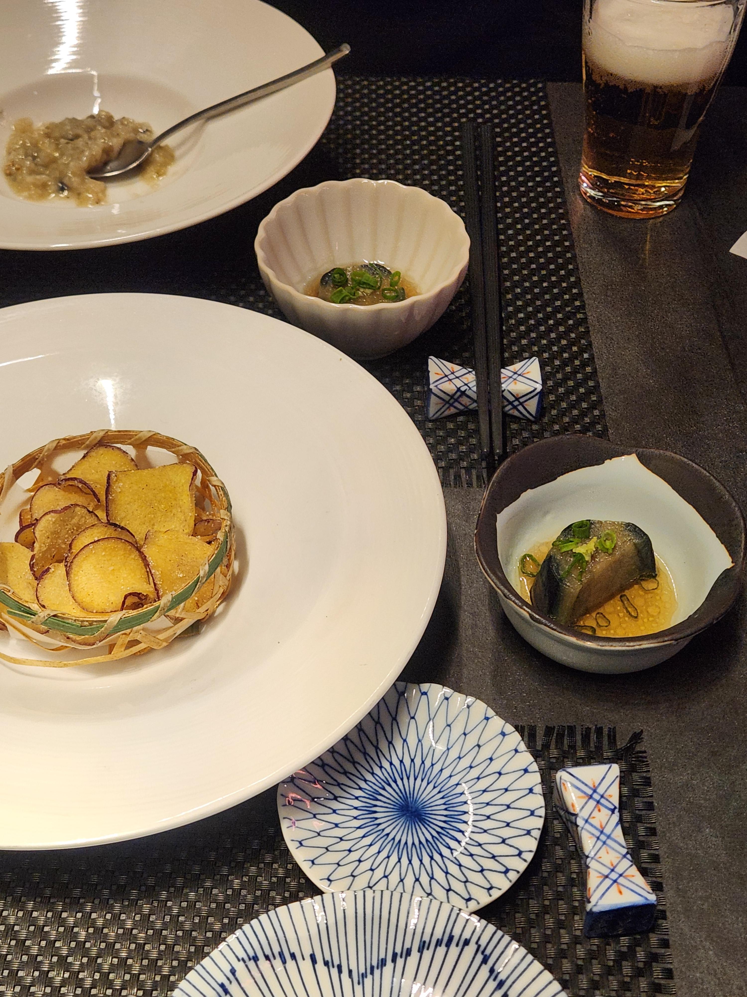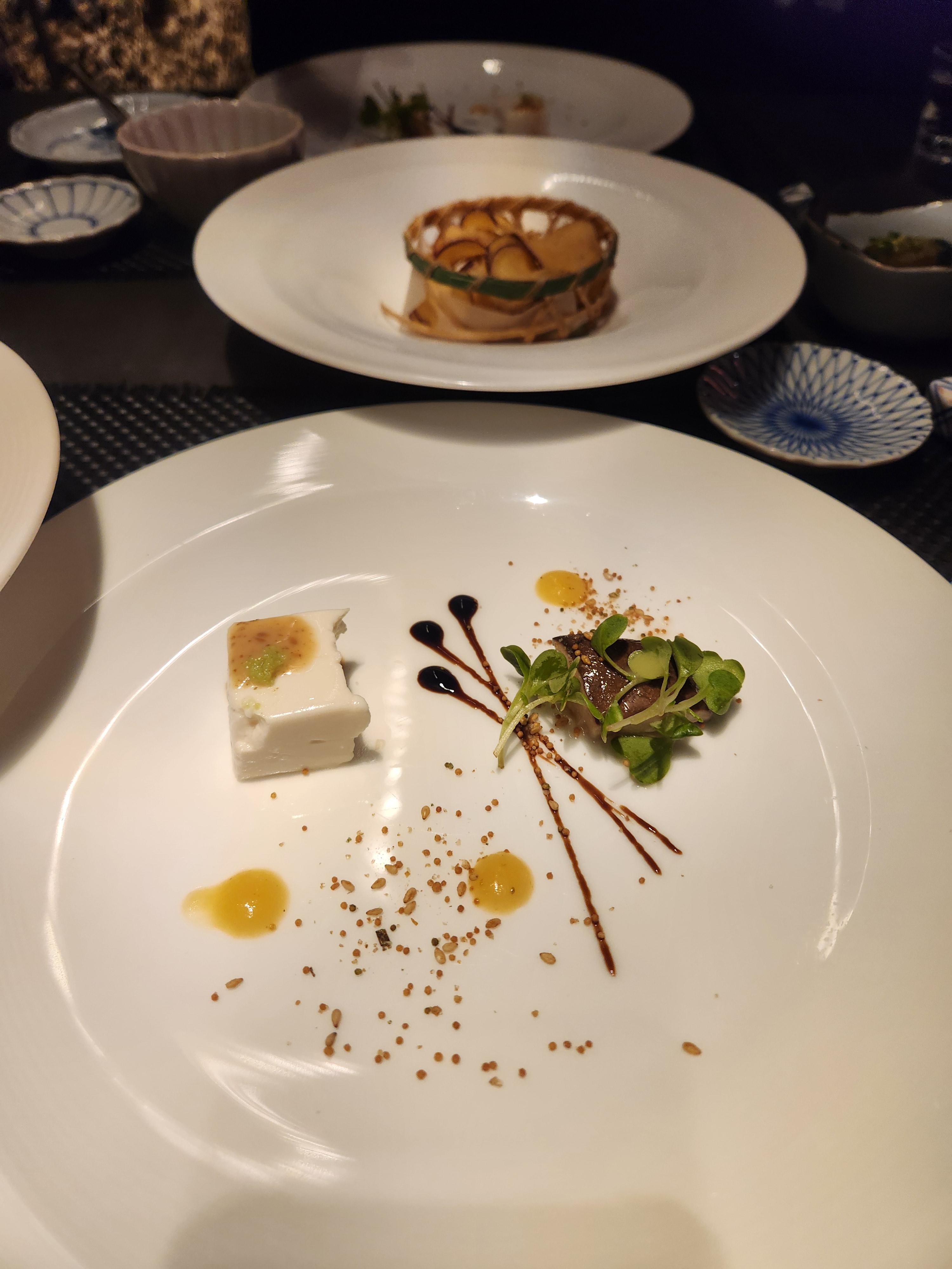 이곳은 코스 형식으로 나오는 구성이라서 천천히 음식을 즐기기에 아주 좋은 곳이에요. 식전 일본식 두부 부터 시작해서 하나씩 정성 들여 나온 요리들이 계속 이어지는데, 그 플레이팅이 참 예뻤어요. 마치 작품처럼 정돈된 한 접시 한 접시가 나와서 진짜 대접받는 기분이 들었어요.